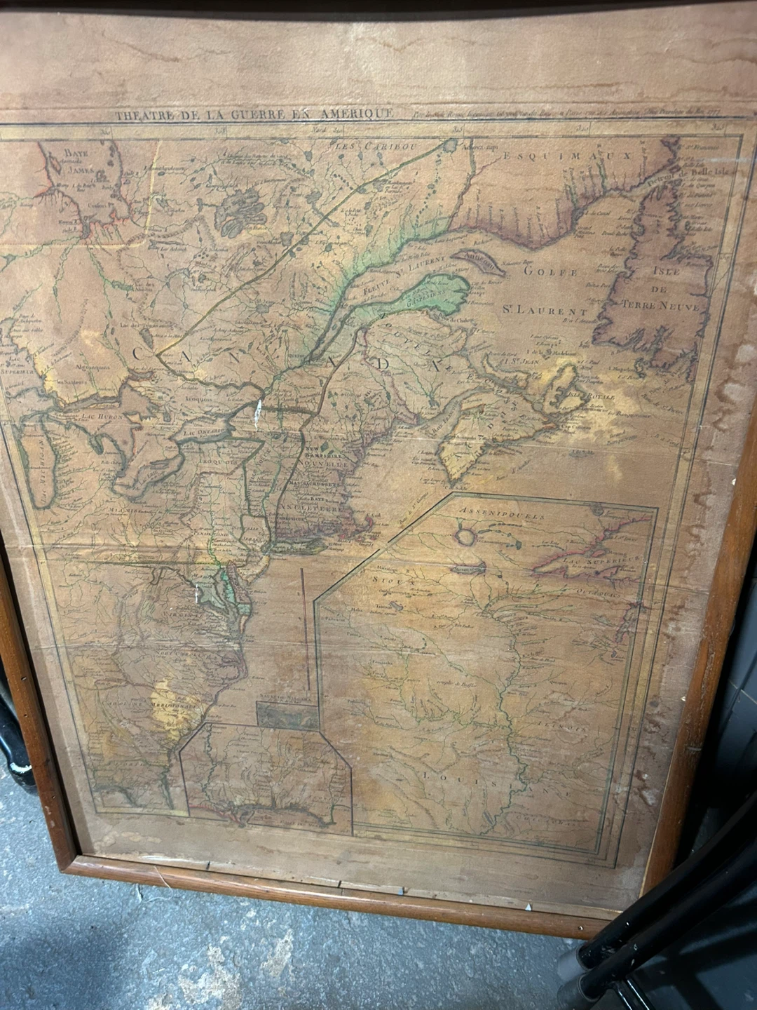 Selling a framed antique map titled 'Theatre de la Guerre en Amerique'. It depicts a historical map of North America, including areas like 'Les Caribou' and 'Isle de Terre Neuve'. The frame is included and ready to be displayed in your home or office