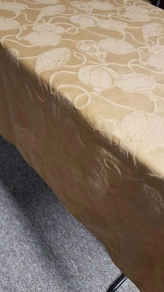 Small custom made Holiday Tablecloth. Antique gold embossed with Xmas Balls. 52" x 56". Fits a 4 ft. Long table without end drop or a card table. Thick Polyester cotton blend. Machine wash and dry. No iron if you take it straight out of the dryer. Smoke/pet free home. Pick up in west end of Peterborough near Glenforest. $5