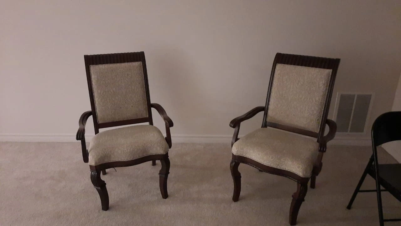 Beautiful solid wood dining table with a rich, brown finish and classic carved legs. Comes with 6 matching upholstered chairs in excellent condition — very comfortable and sturdy.