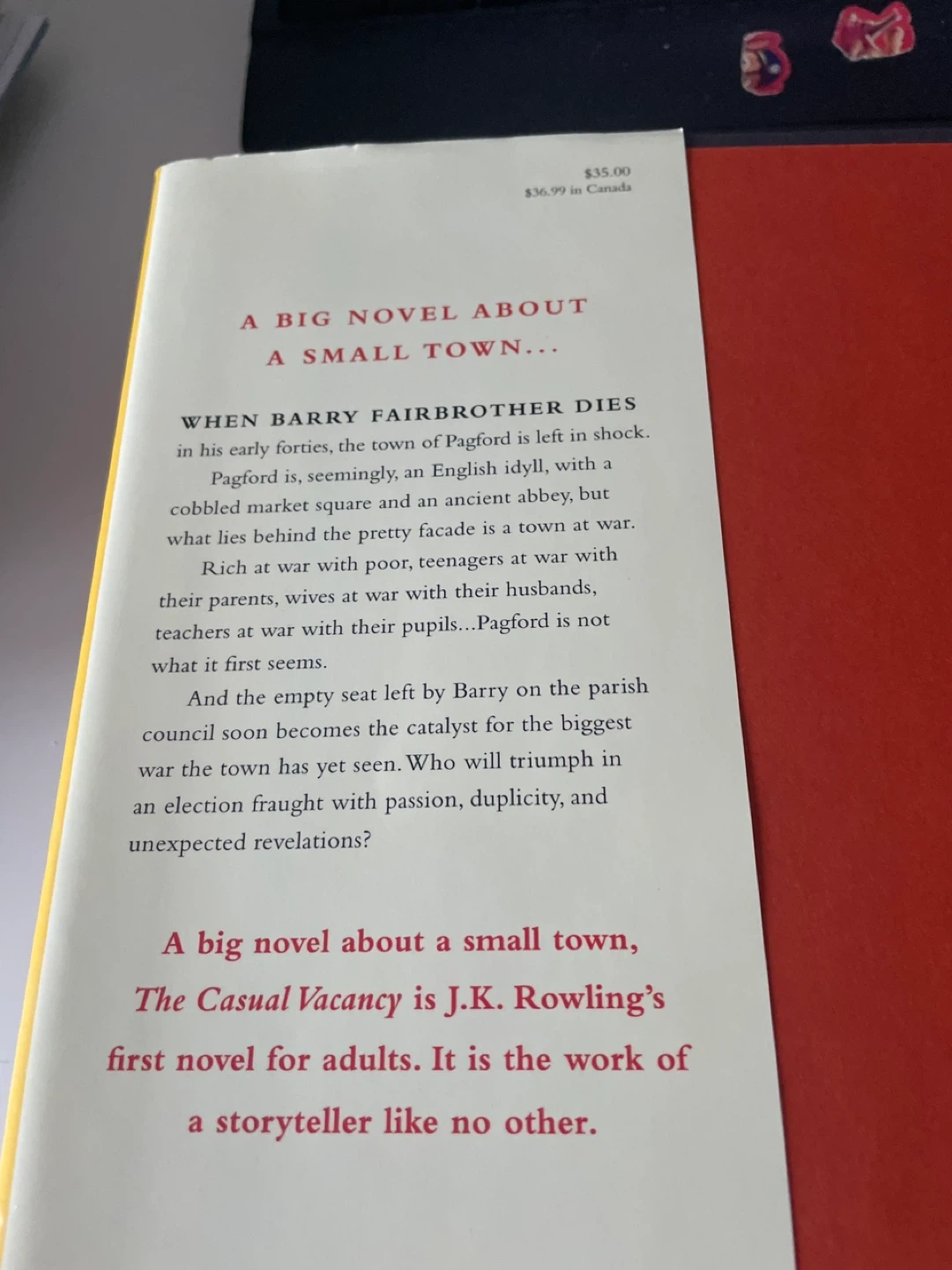 Selling a copy of 'The Casual Vacancy' by J.K. Rowling! It's a novel about a small town, perfect for a good read. The original price was $36.99 in Canada. Hard cover book