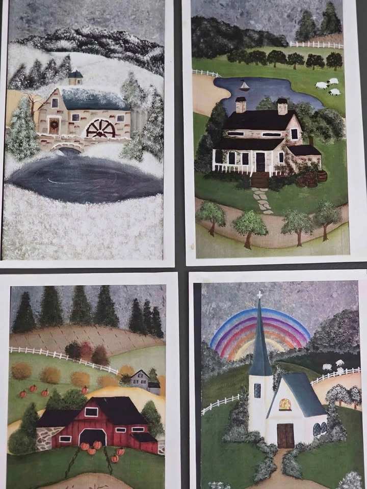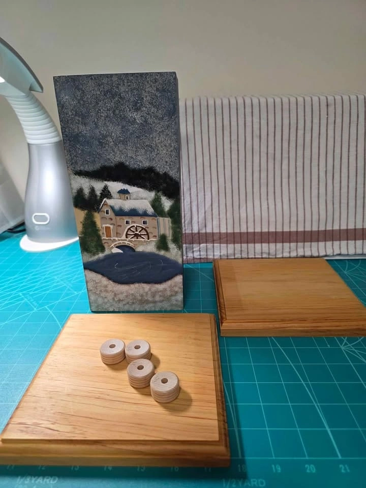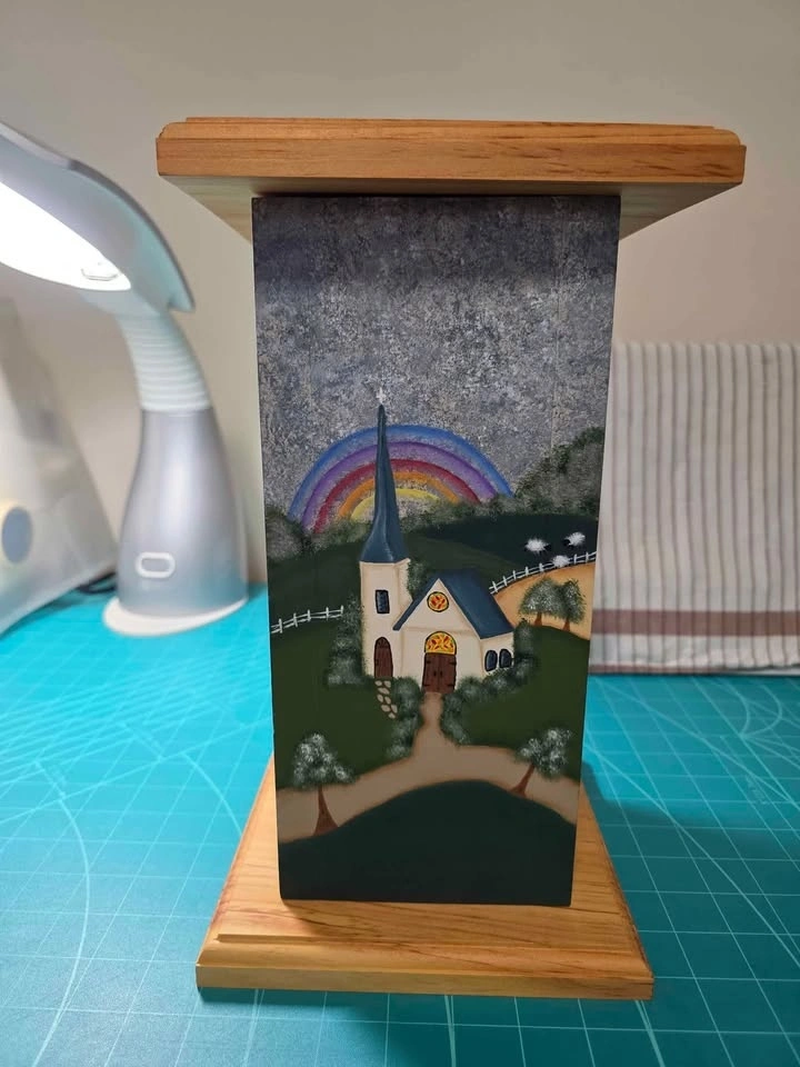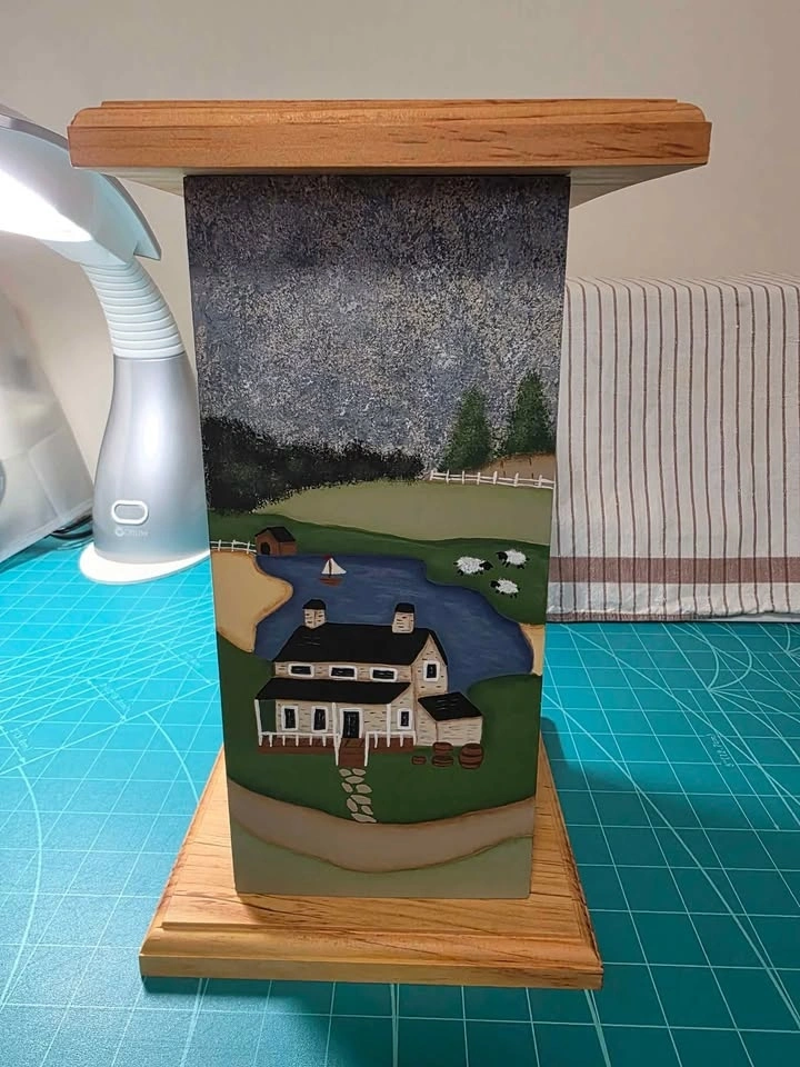 Folk Artist's 4 Season Lamp Base Project to Finish. Stands 13" tall. Flat base is 7" square. All four sides are painted. It just need some finishing details added. Pattern included. Solid wood. Can be made into a Lamp. Round disc feet included. A perfect sun room or cottage piece. Smoke/pet free home. Pick up in west end of Peterborough. $20