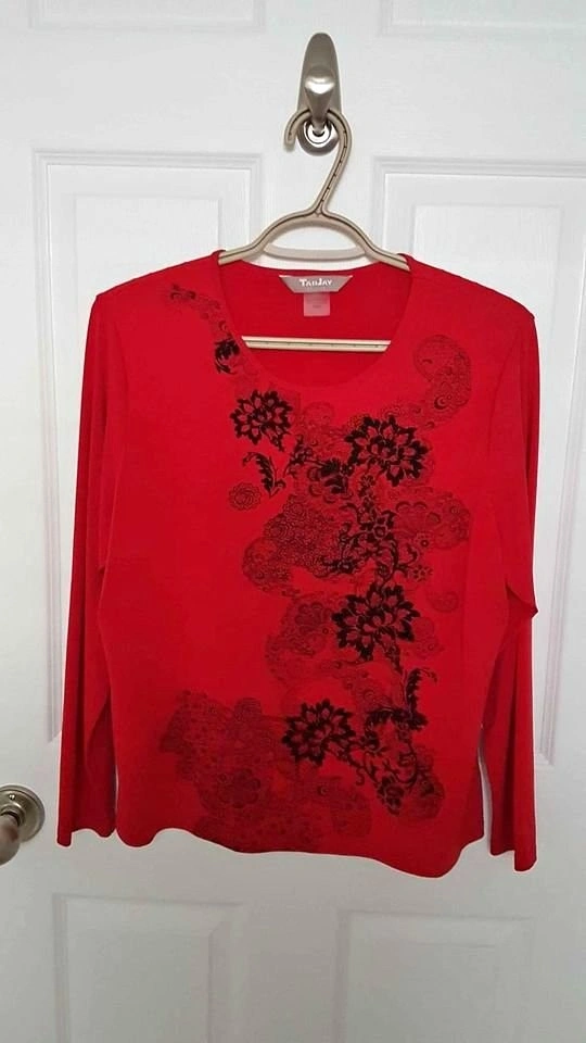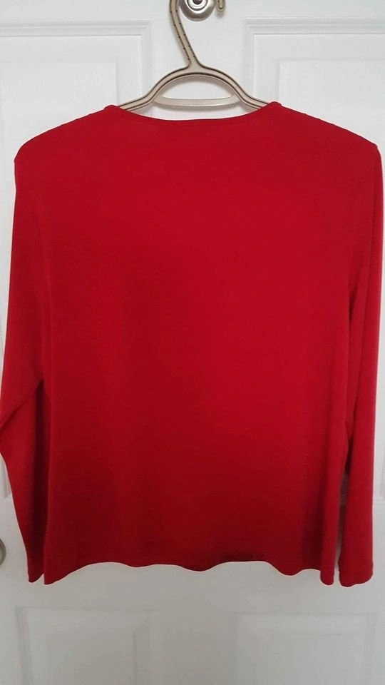 Women's Red Size Medium Petite Length long sleeved top. Black fancy embellishments on front. Plain back. Polyester spandex blend. Washable. Only wore a few times. Like new. Smoke/pet free home. Pick up west end of Peterborough. $5
