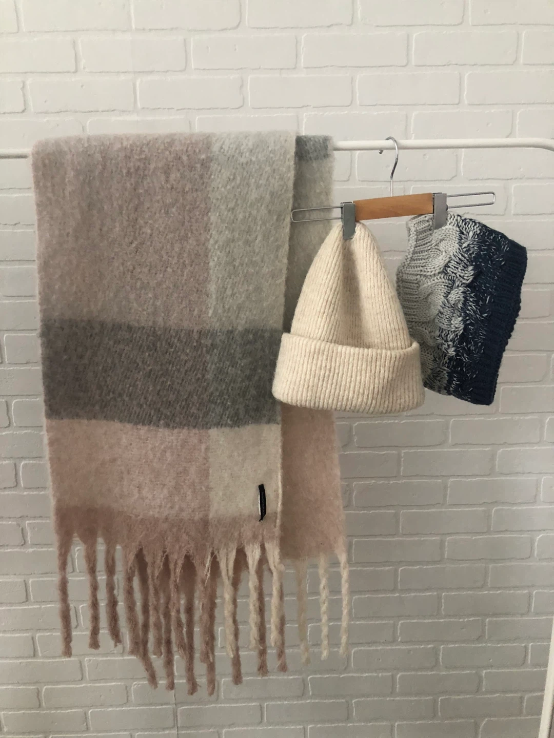 Here's a cozy set including a Banana Republic in soft pastel colours scarf and a Zara beanie! The scarf has a lovely neutral colour palette. The Zara beanie is a size M.