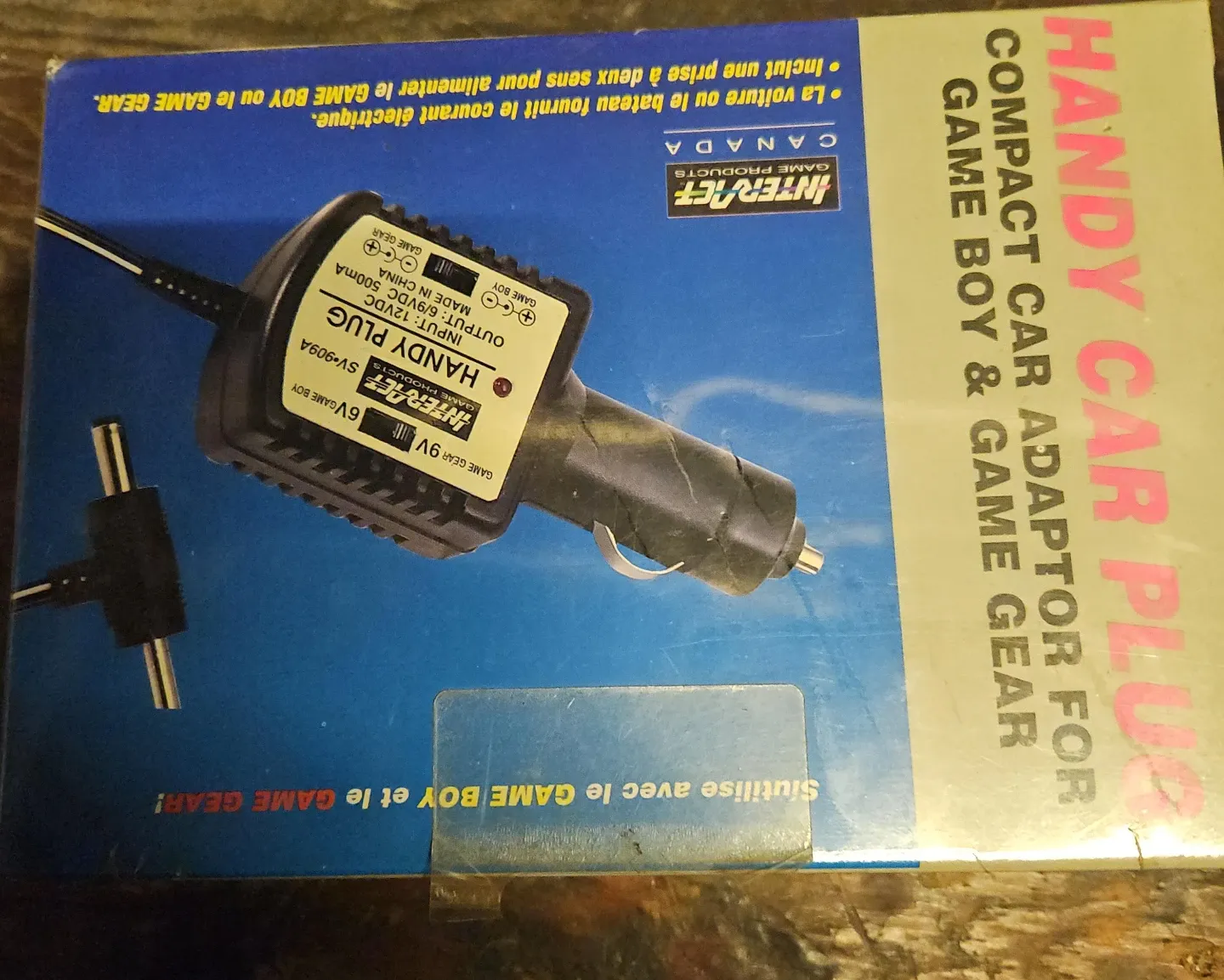 Selling a compact car adaptor for your Game Boy and Game Gear! It's an Interact Handy Plug, model SV-909A. The box mentions it includes a dual-purpose plug for powering either a Game Boy or Game Gear from your car or boat's 12V outlet. Get your retro gaming fix on the go!