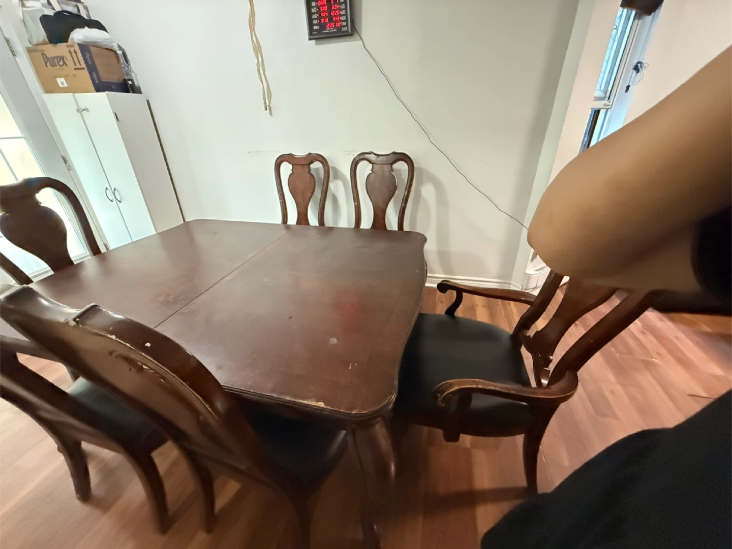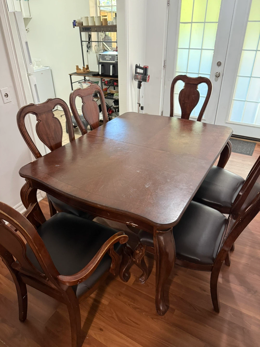 Giving away a dining table with 6 chairs. It's a sturdy set with a classic design. The table has some wear and tear, but it's still in good condition for everyday use. The chairs have brown leather seats. Perfect for a family trying to save a little cash!