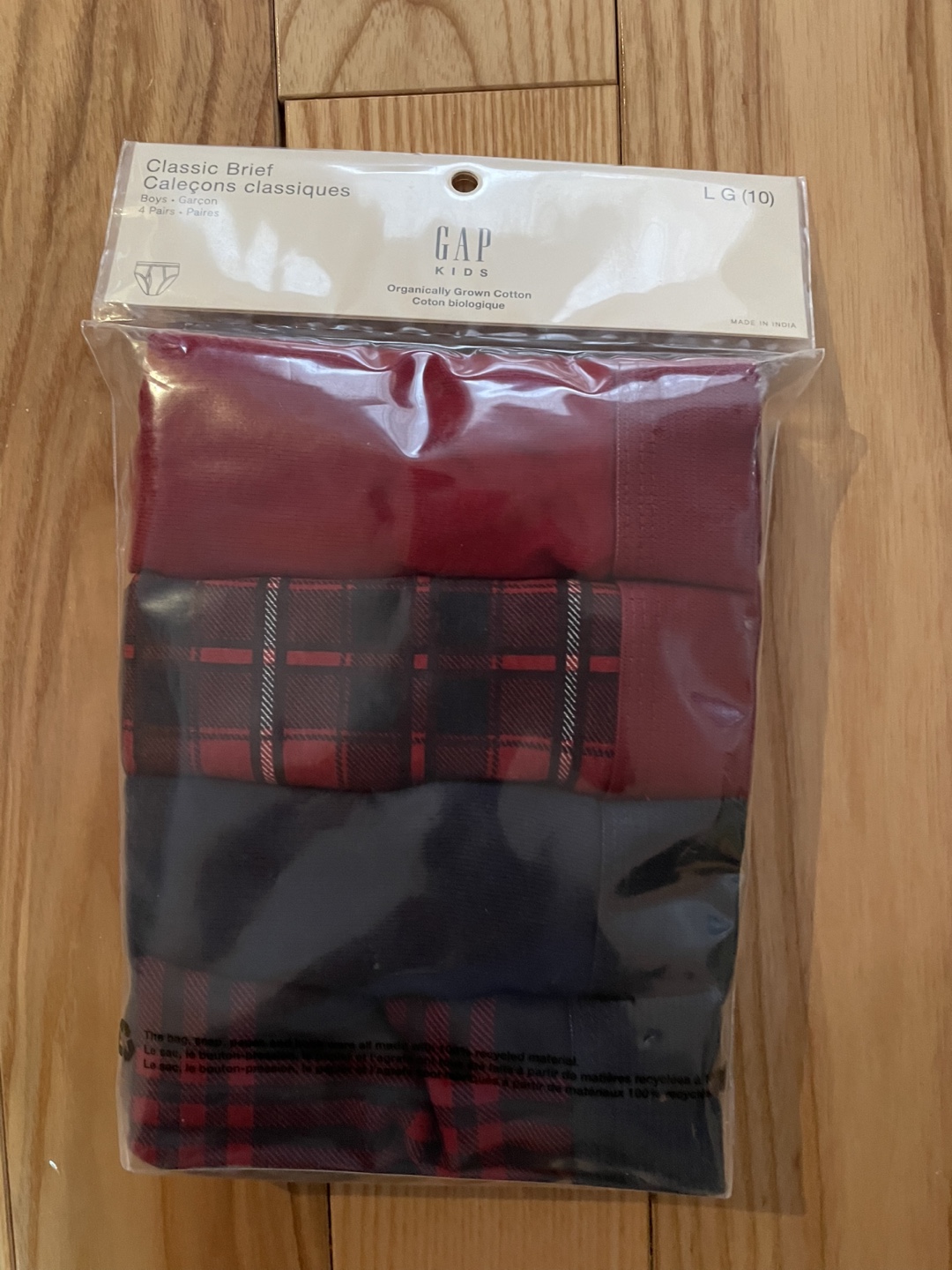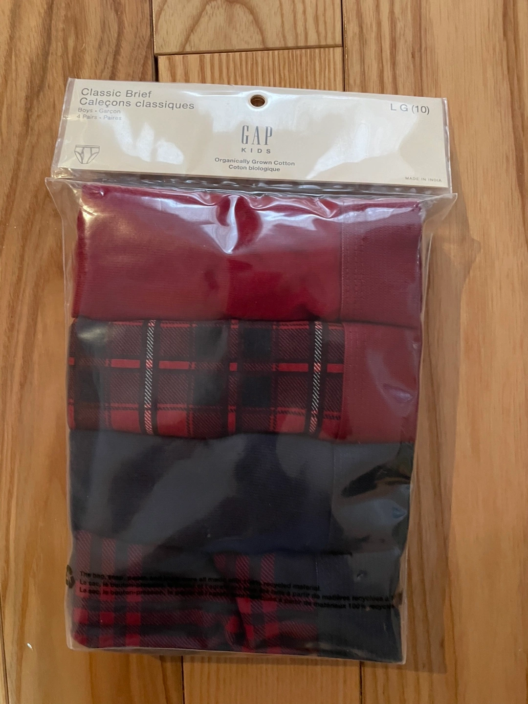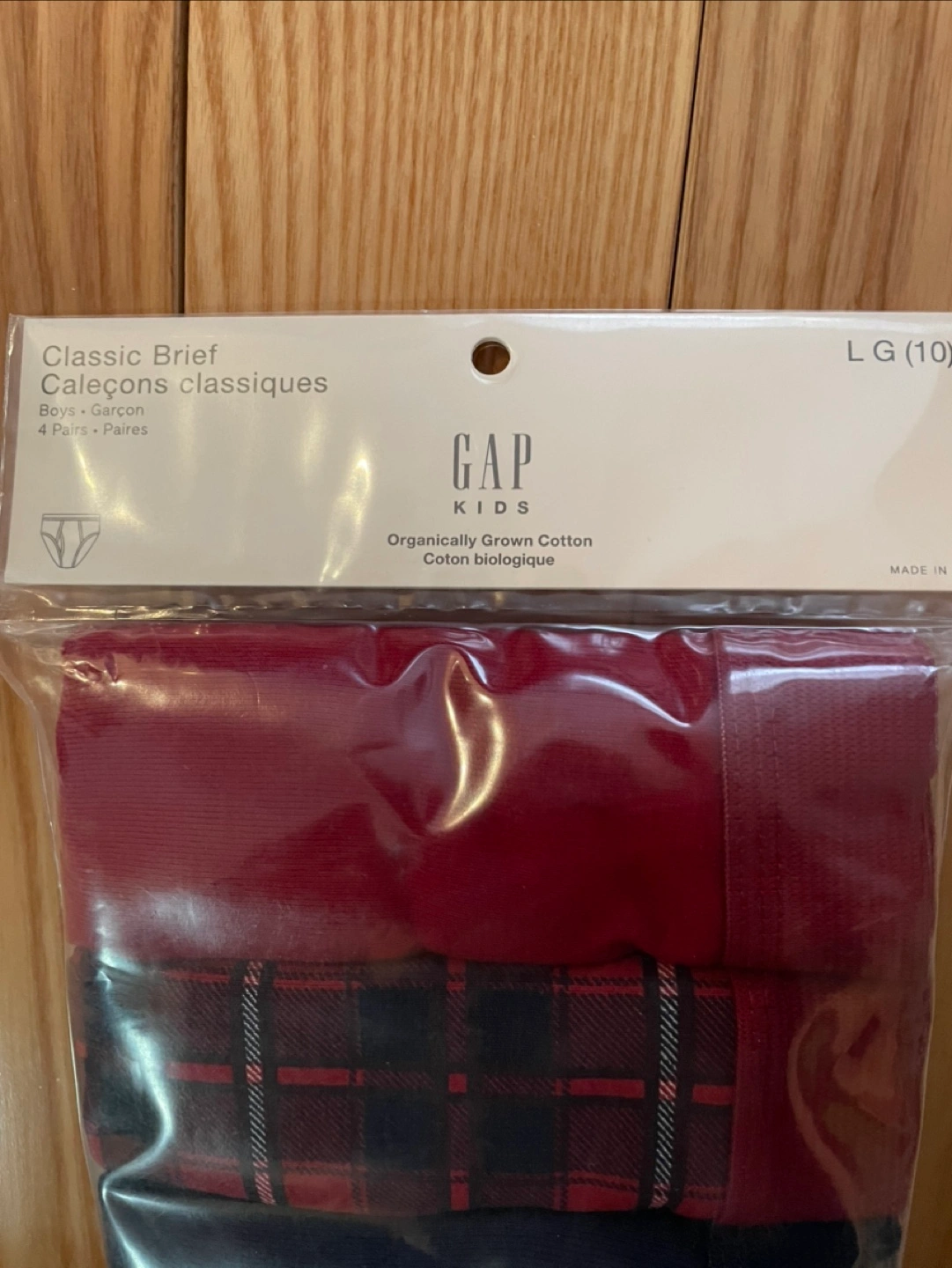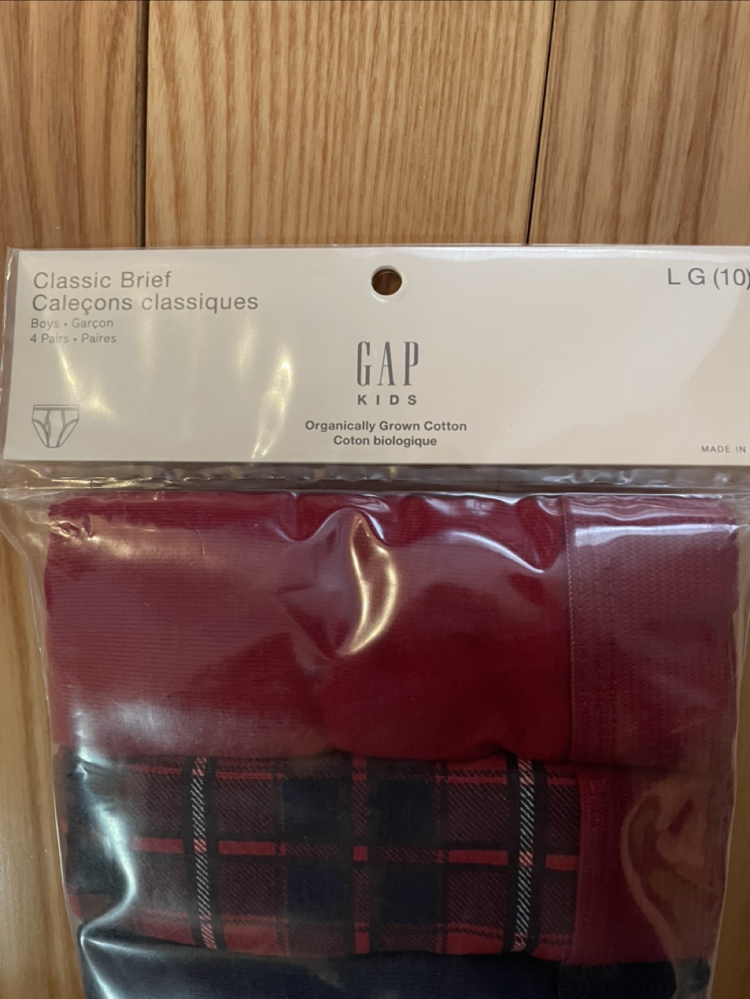a brand new pack of GAP Kids Classic Briefs! This pack includes 4 pairs of boys' briefs in assorted colours and patterns. They are made with organically grown cotton and are size Large (10). Originally priced for $44.95