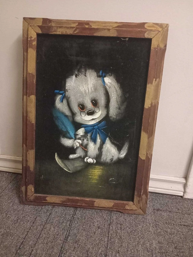This is a vintage dog painting in a wooden frame. It's a charming piece of art with a retro feel. The painting is in used condition, showing some wear and tear that adds to its vintage appeal. * **Style**: Vintage * **Subject**: Dog This unique piece would be a quirky addition to any room! I'm decluttering my space, and this adorable painting needs a new home to be appreciated!