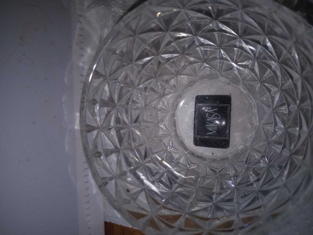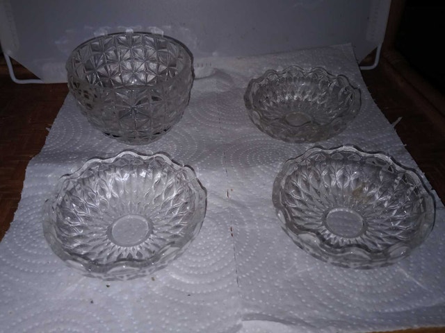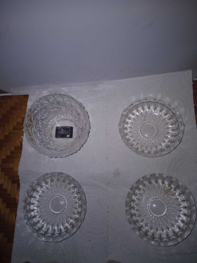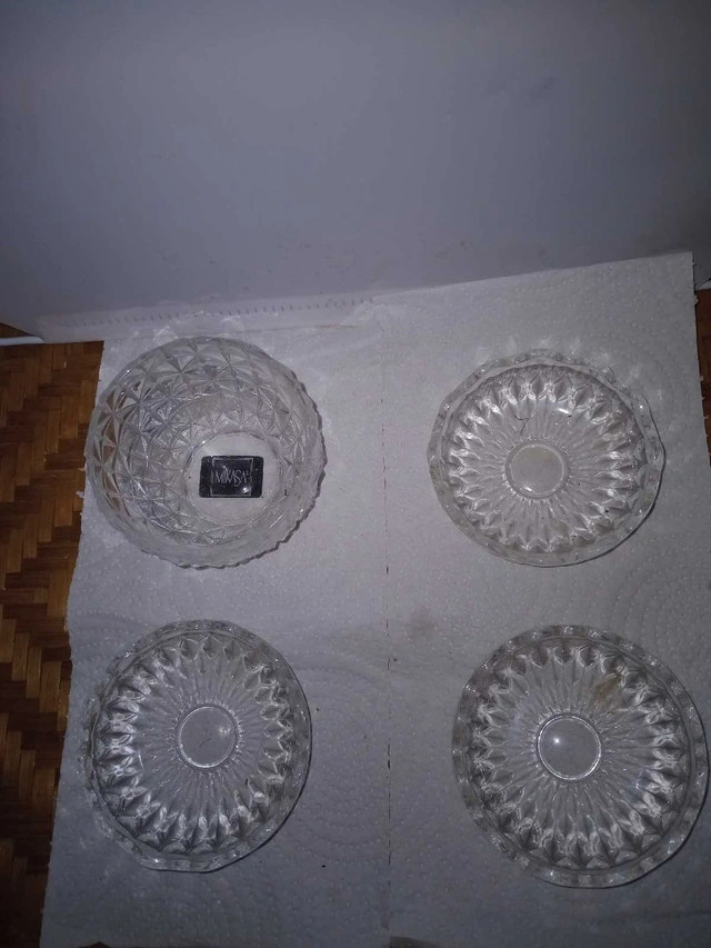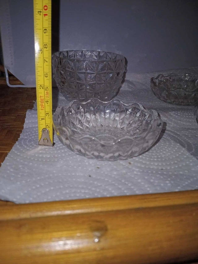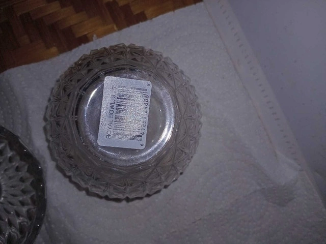 I'm offering a set of four glass dishes, including one Mikasa bowl and one Royal bowl, all in excellent condition. These bowls feature a beautiful, clear glass design that adds a touch of elegance to any table setting. The Mikasa bowl has a unique geometric pattern, while the Royal bowl and smaller dishes have a delicate, fluted edge. Perfect for serving desserts, snacks, or as decorative pieces. * Brands: Mikasa and Royal Bowl * Material: Glass * Condition: Good