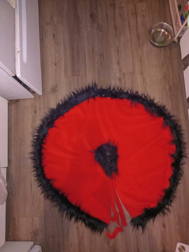 Add a festive touch to your holiday decor with this red Christmas tree skirt, trimmed with black faux fur! This used skirt is in good condition and ready to adorn your Christmas tree. Perfect for adding a pop of colour and a touch of elegance to your living room. Spruce up your holiday season without breaking the bank! I'm offering this lovely skirt at a great price of $25. If the ad's up, it's still available, so no need to ask! Don't miss out on this holiday must-have!