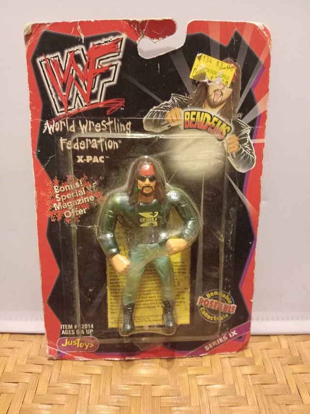Relive the glory days of wrestling with this vintage WWF X-PAC Bend-Ems action figure from Justoys, a true collectible for any fan! This bendable, poseable figure captures the essence of the wrestling superstar, complete with his signature look. While this figure has been well-loved and shows signs of its age, it remains a fantastic piece of memorabilia. Perfect for display or nostalgic play!