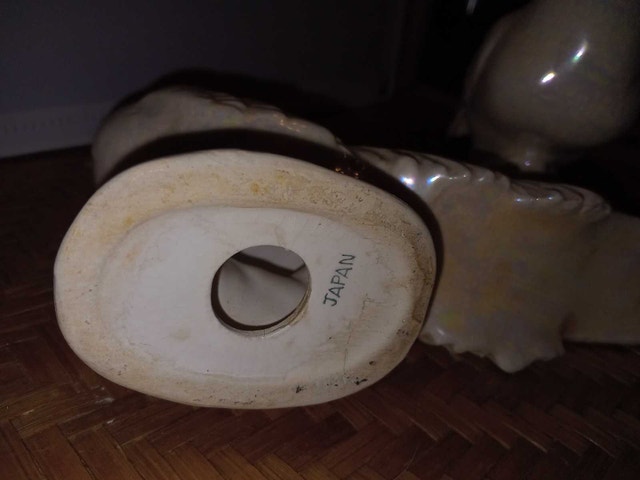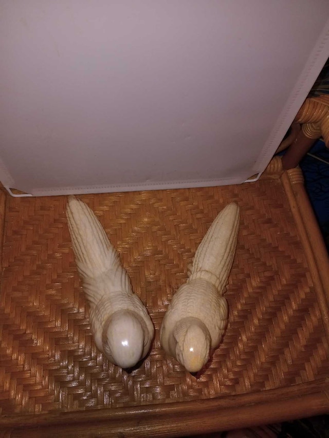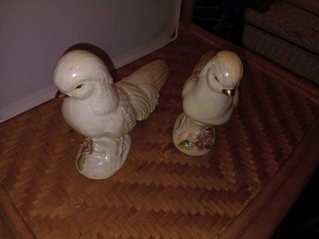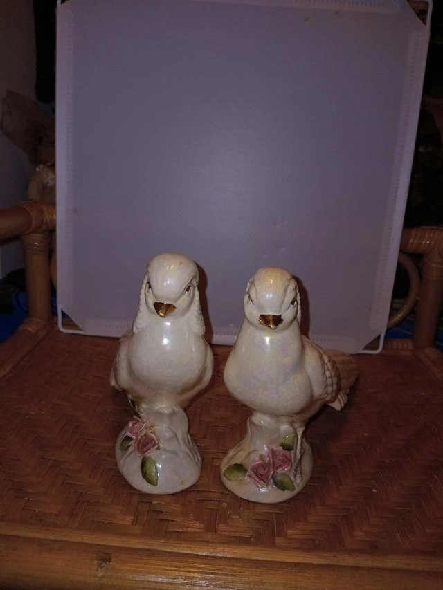 These are vintage bird figurines, likely dating back to the mid-century era, and are in good condition, with a pearlescent finish and delicate rose accents at their bases, standing approximately 4 inches tall. Given their vintage nature, they would make a charming addition to any collection or as a quaint decorative piece in your home!