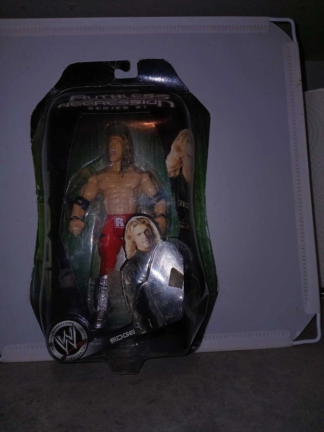 Get ready to rumble with this new in package WWE Ruthless Aggression Series 31 Edge action figure, a must-have for wrestling fans and collectors alike! This figure captures Edge in his iconic ring gear, ready to deliver his signature moves. The figure is still sealed in its original packaging, ensuring its pristine condition. Specifications: * Character: Edge * Series: Ruthless Aggression * Series Number: 31 * Condition: New in package Dust off your championship belts and make some room on your shelves, because this Edge figure is ready to bring the excitement of WWE right into your home. If the ad is up, the figure is still available, so grab it before someone else pins it down!