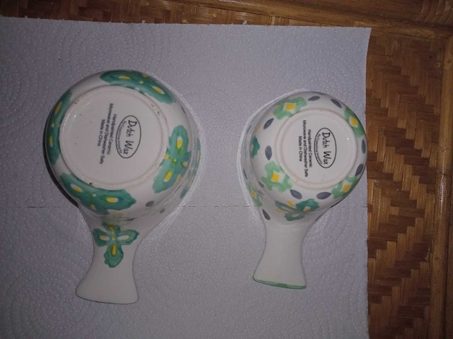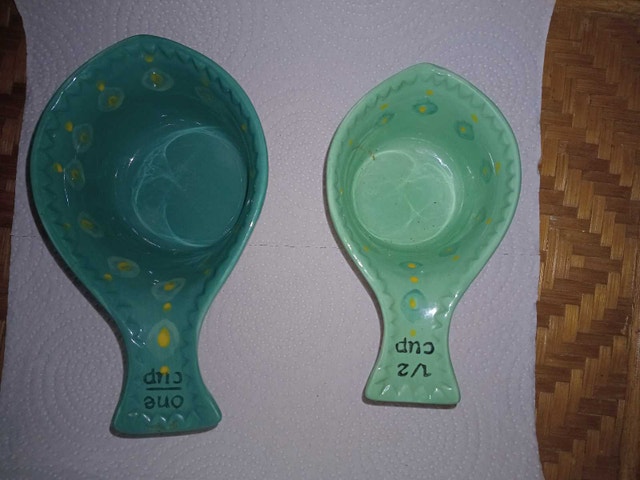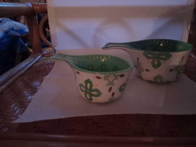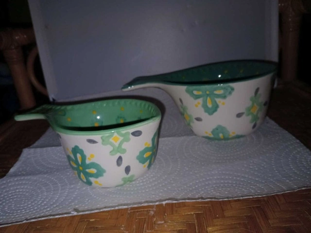 Add a touch of floral charm to your kitchen with this set of two Dish Wax ceramic measuring cups, including a 1-cup and 1/2-cup size, adorned with a delightful green floral pattern. These cups are in used, but good condition, ready to bring a bit of whimsy to your baking adventures. Only these two available If you've been eyeing some cute measuring cups, these are perfect. And just so you know—if the ad is up, they're still available, so don't hesitate!
