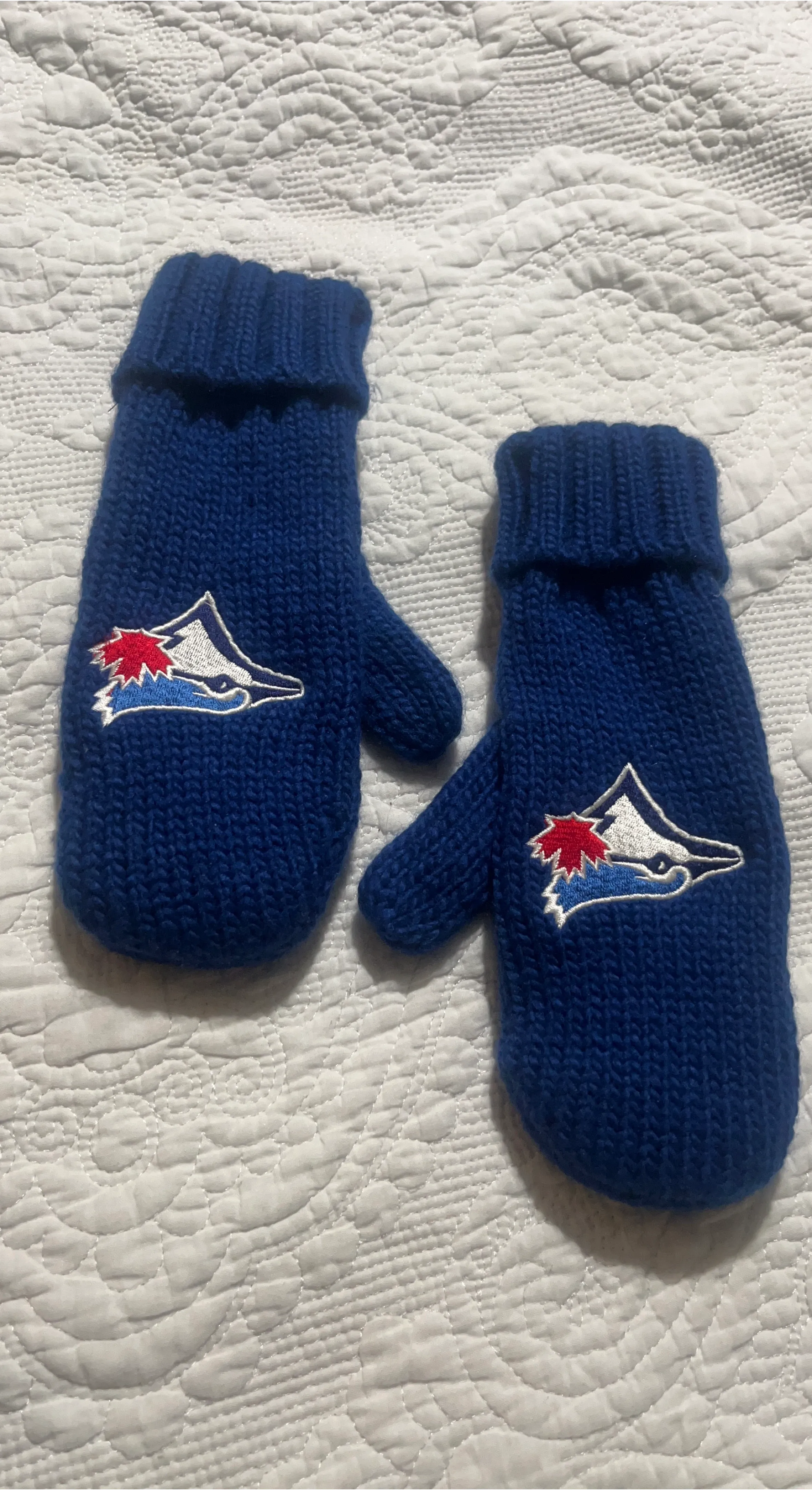 Selling a pair of Toronto Blue Jays mittens! They're a cozy blue knit with the team logo on each one. Perfect for keeping your hands warm while showing your team spirit!