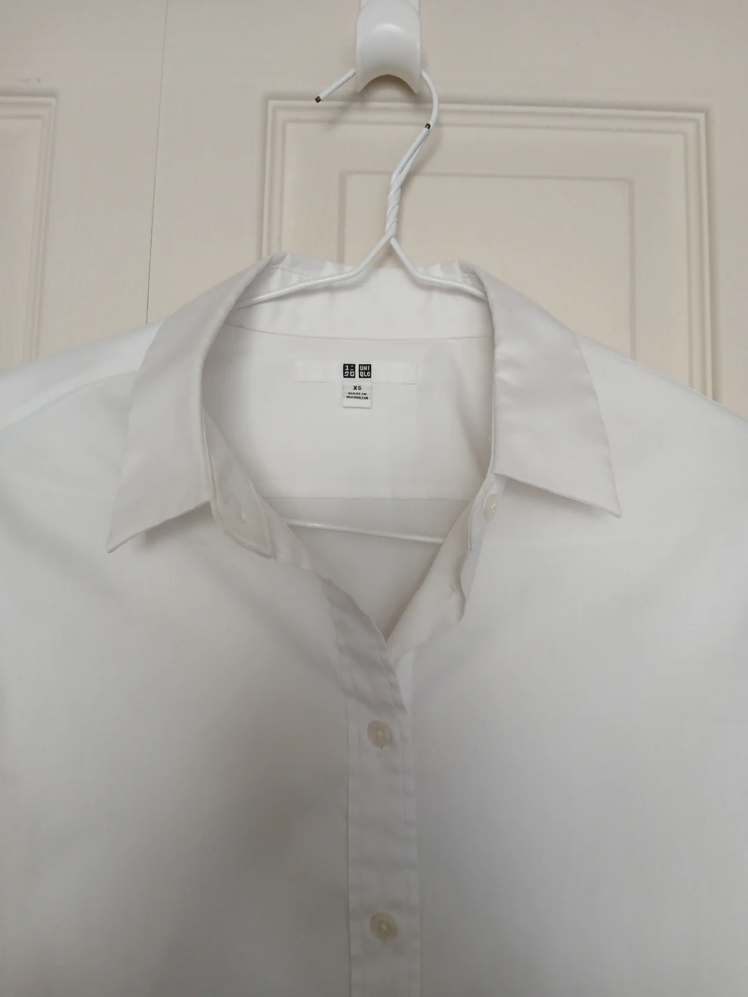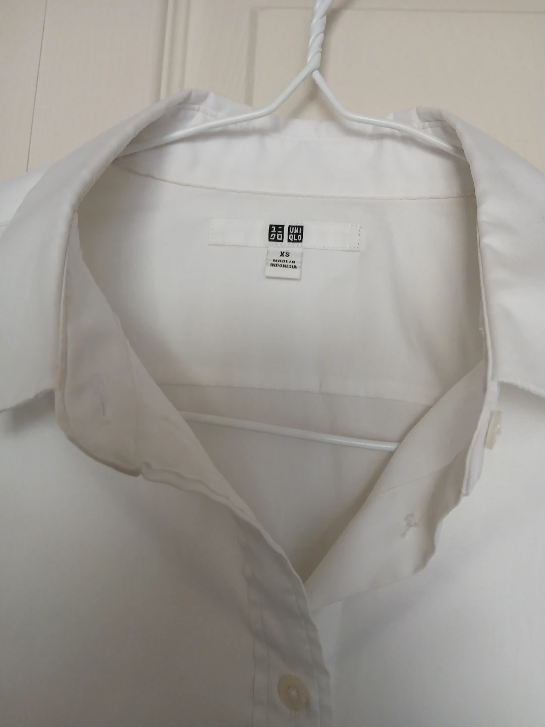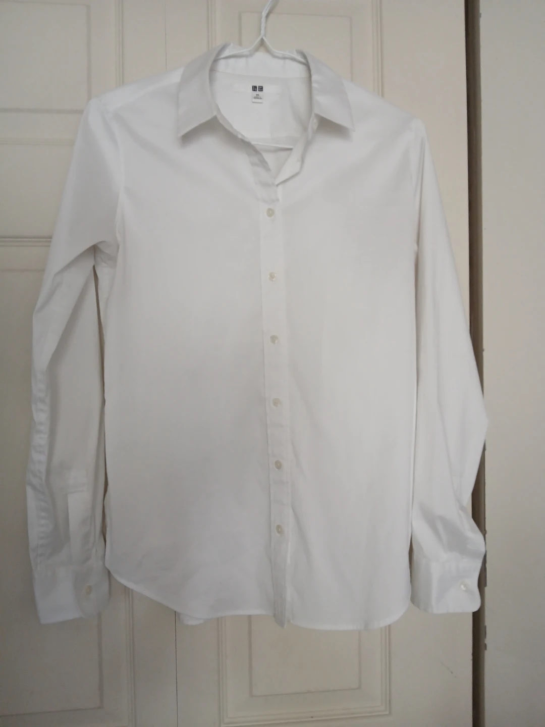 Type: Longsleeved button up dress shirt. A classic white shirt by Uniqlo, perfect for any occasion.