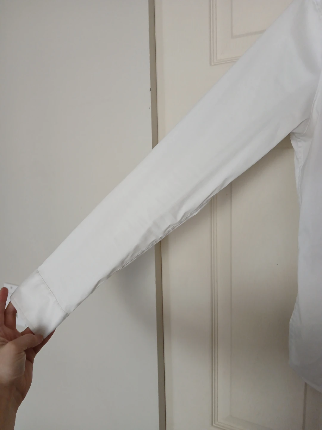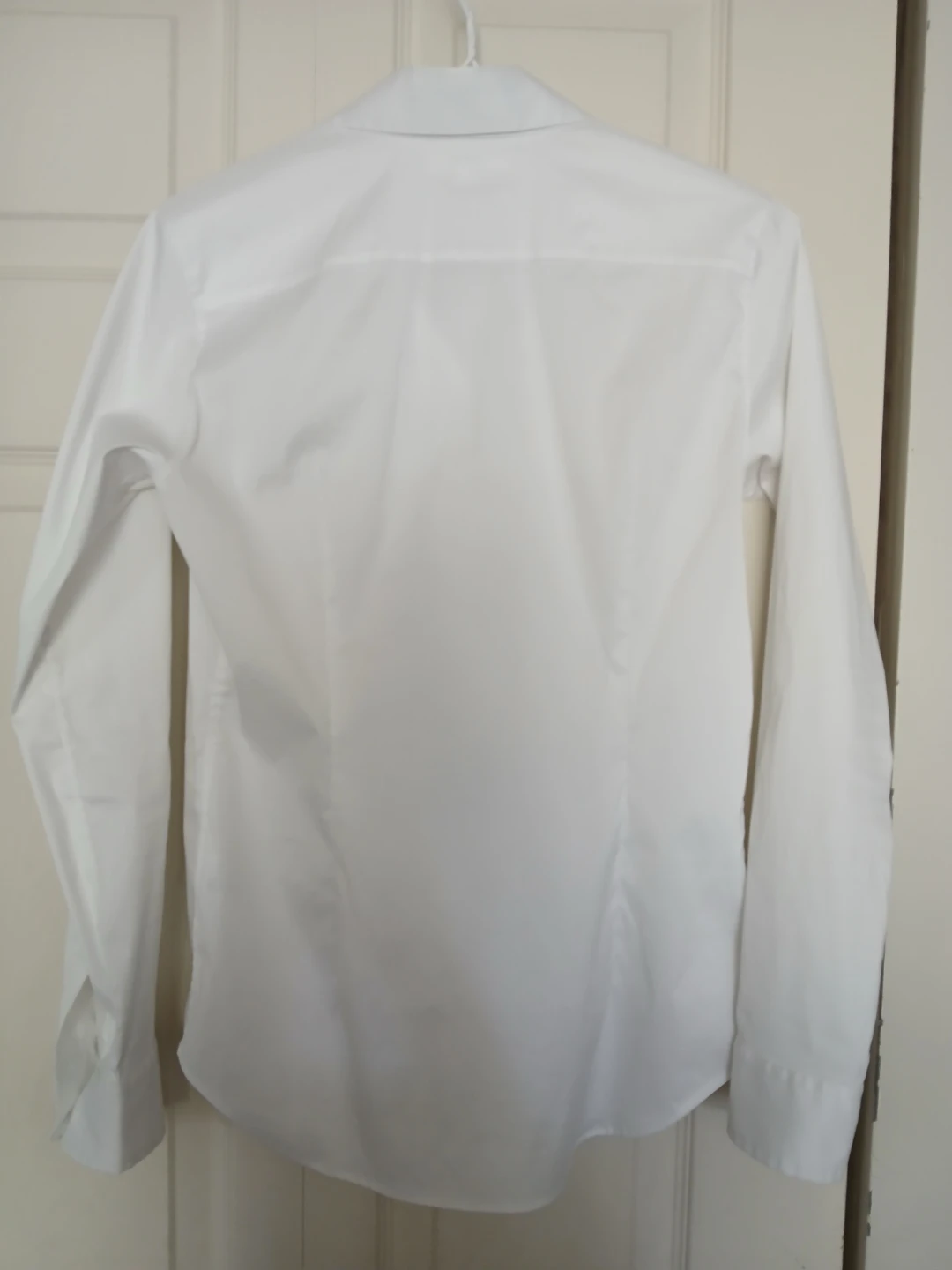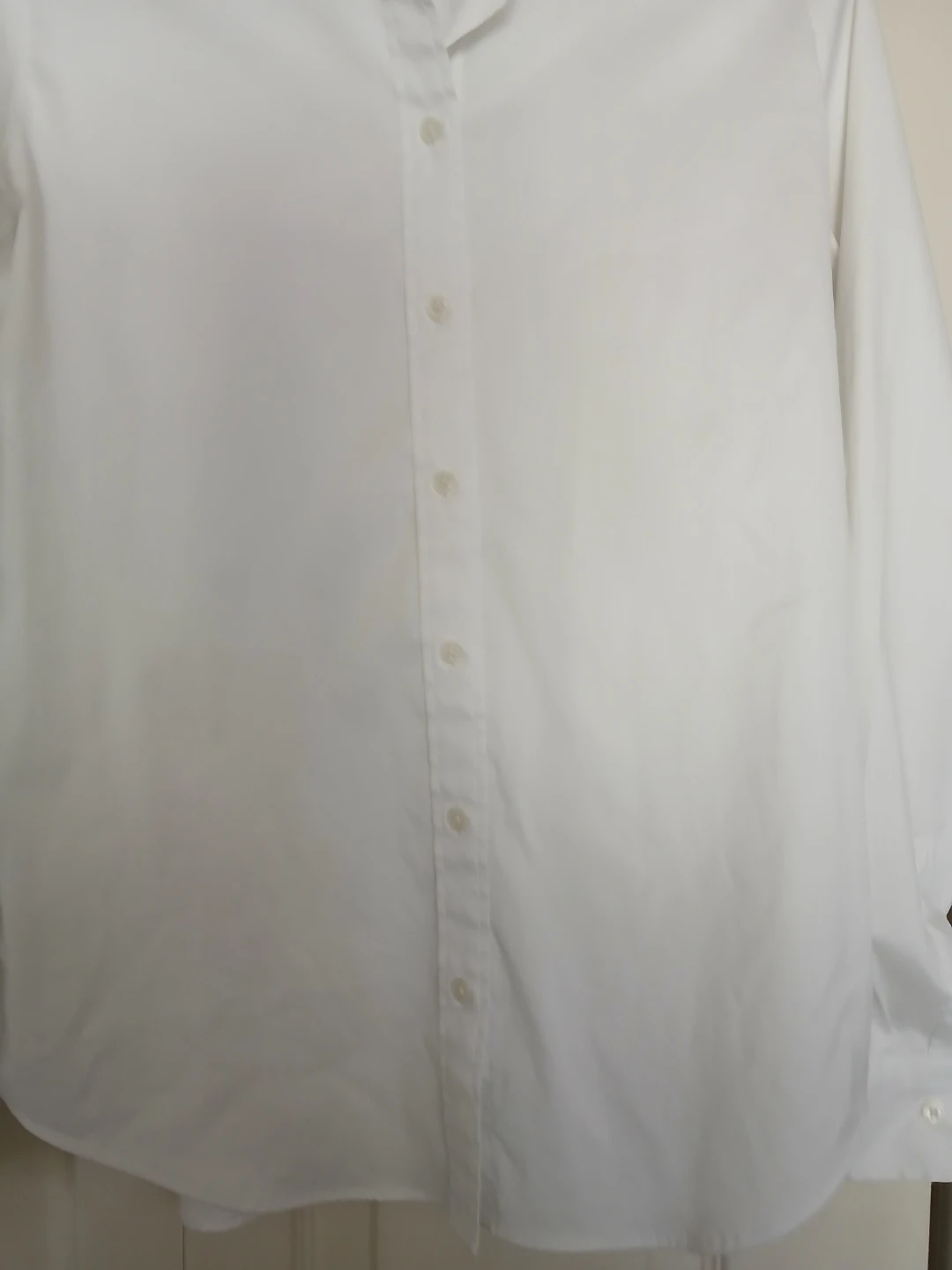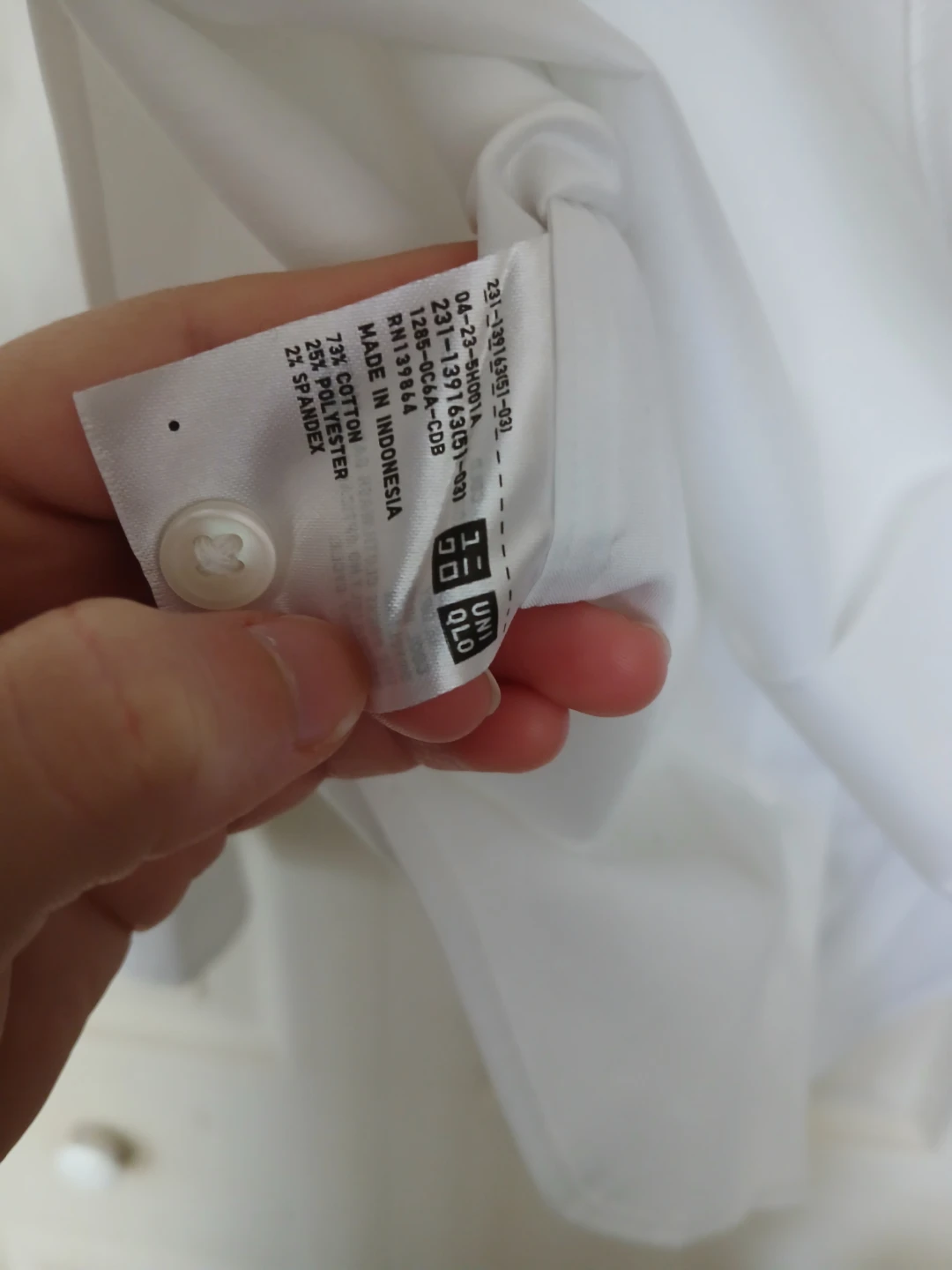 Type: Longsleeved button up dress shirt. A classic white shirt by Uniqlo, perfect for any occasion.