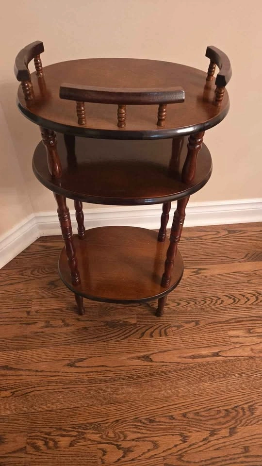 This is a vintage mahogany three-tiered wooden étagère side table or plant stand, with a convienient little drawer. Styling from around 1940.