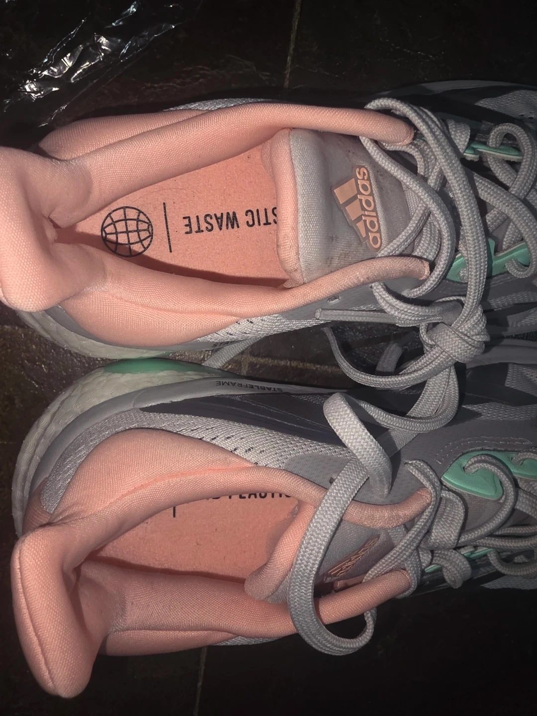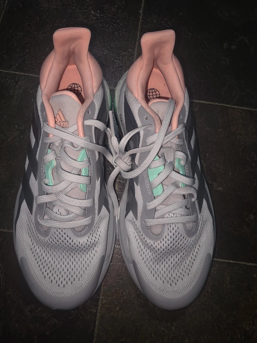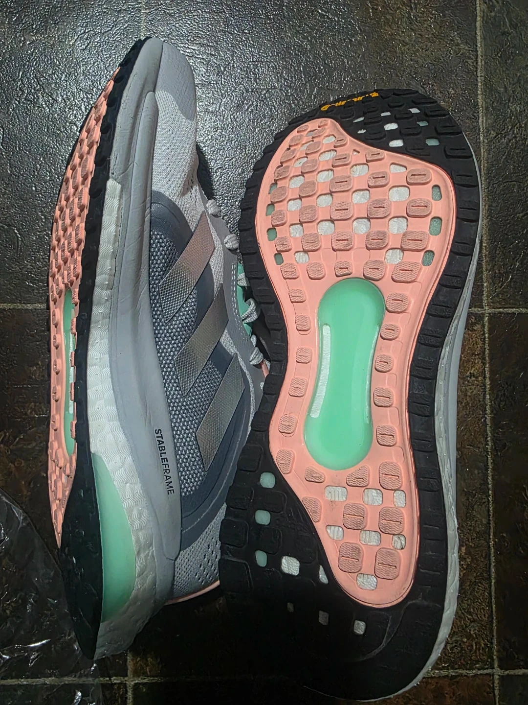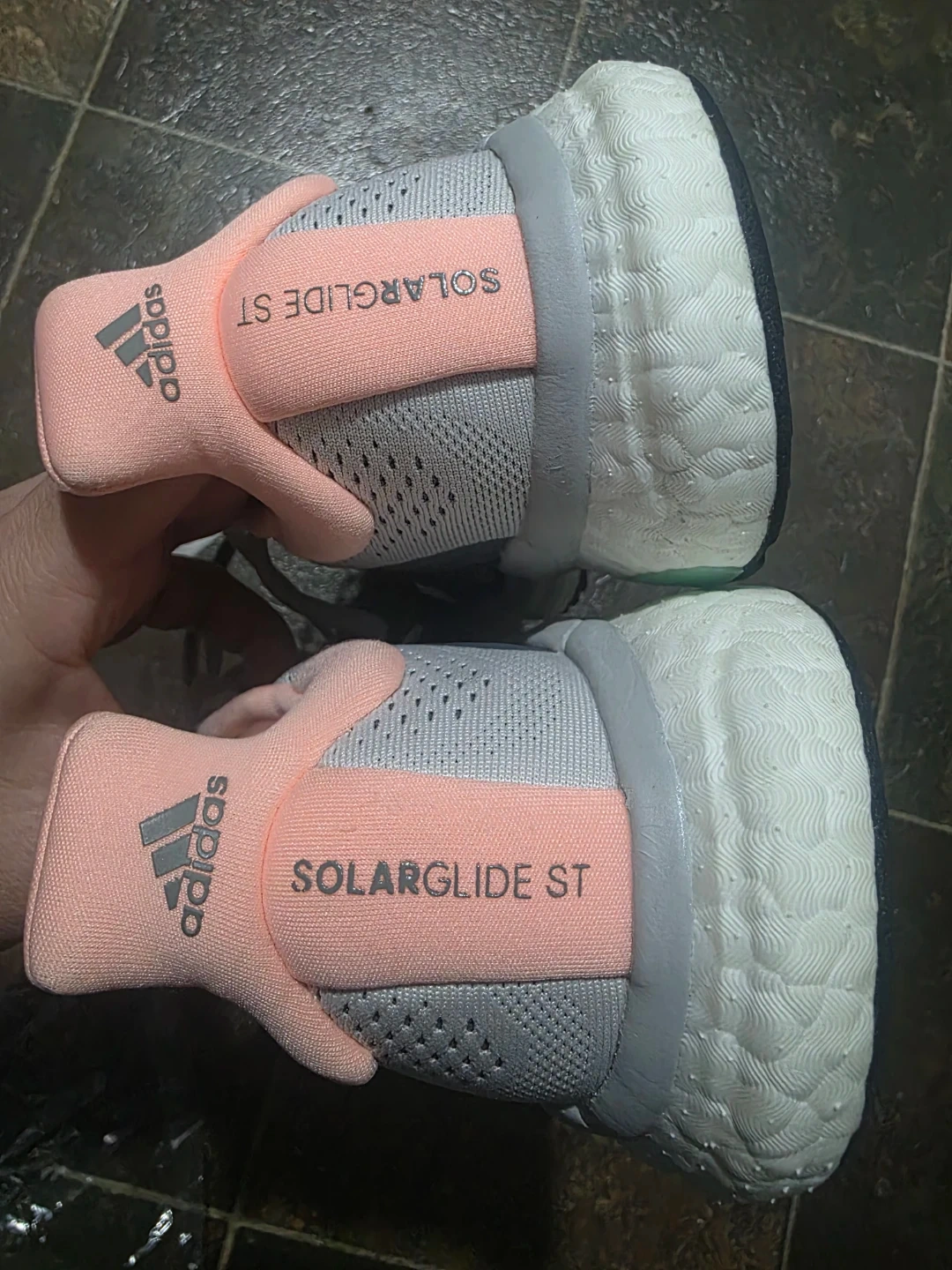 Selling a pair of Adidas SolarGlide ST running shoes. They are gray with peach and mint green accents. These shoes feature a STABLEFRAME for support and a Continental rubber outsole for great traction. Perfect for your next run!