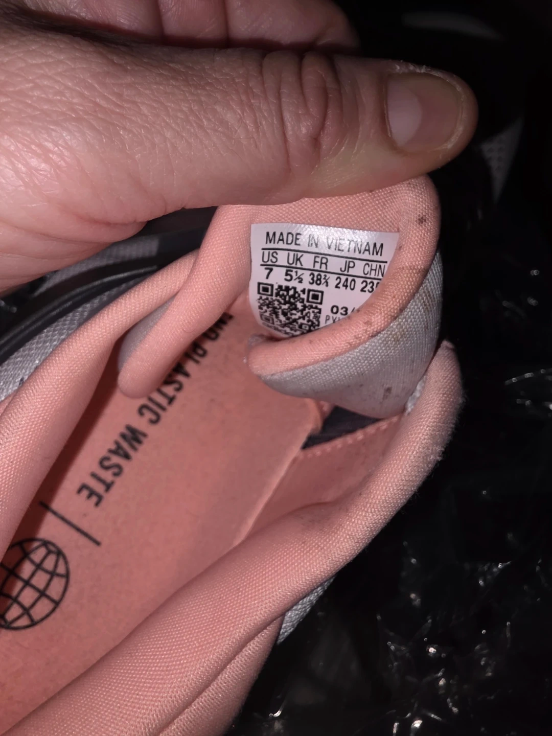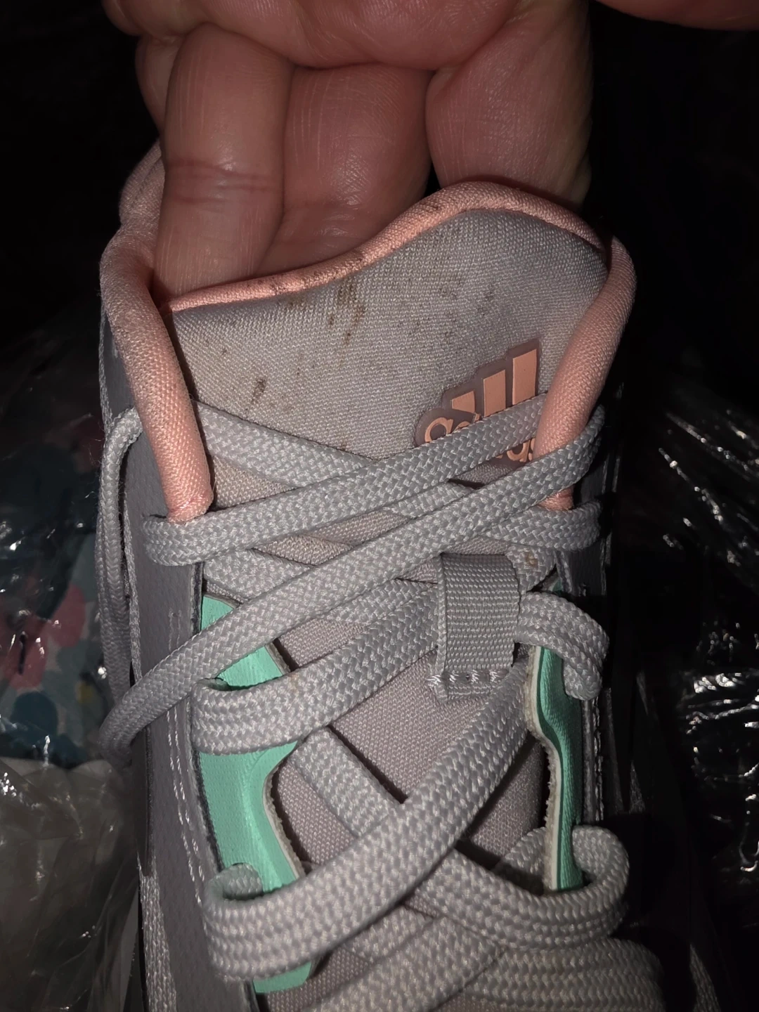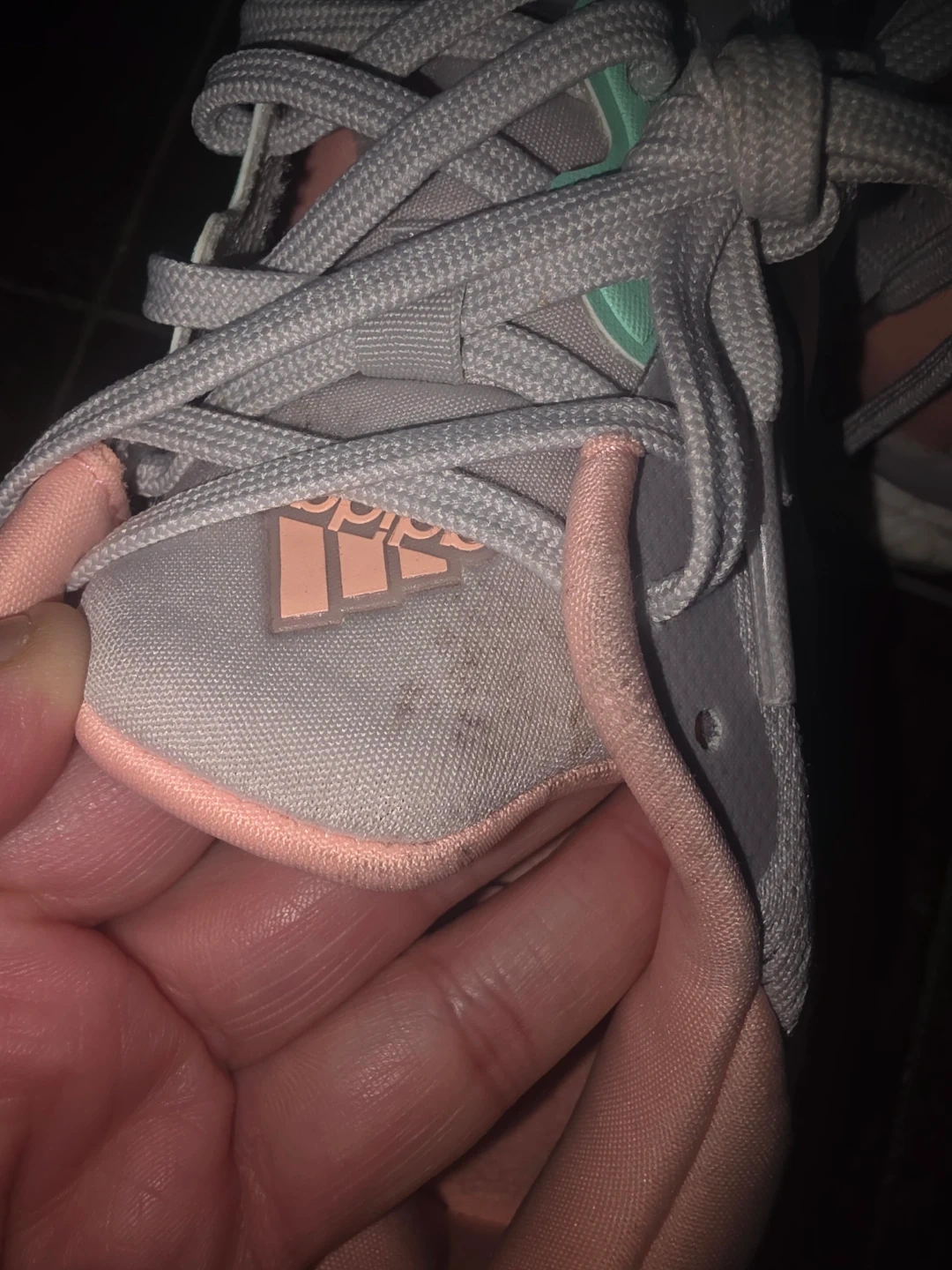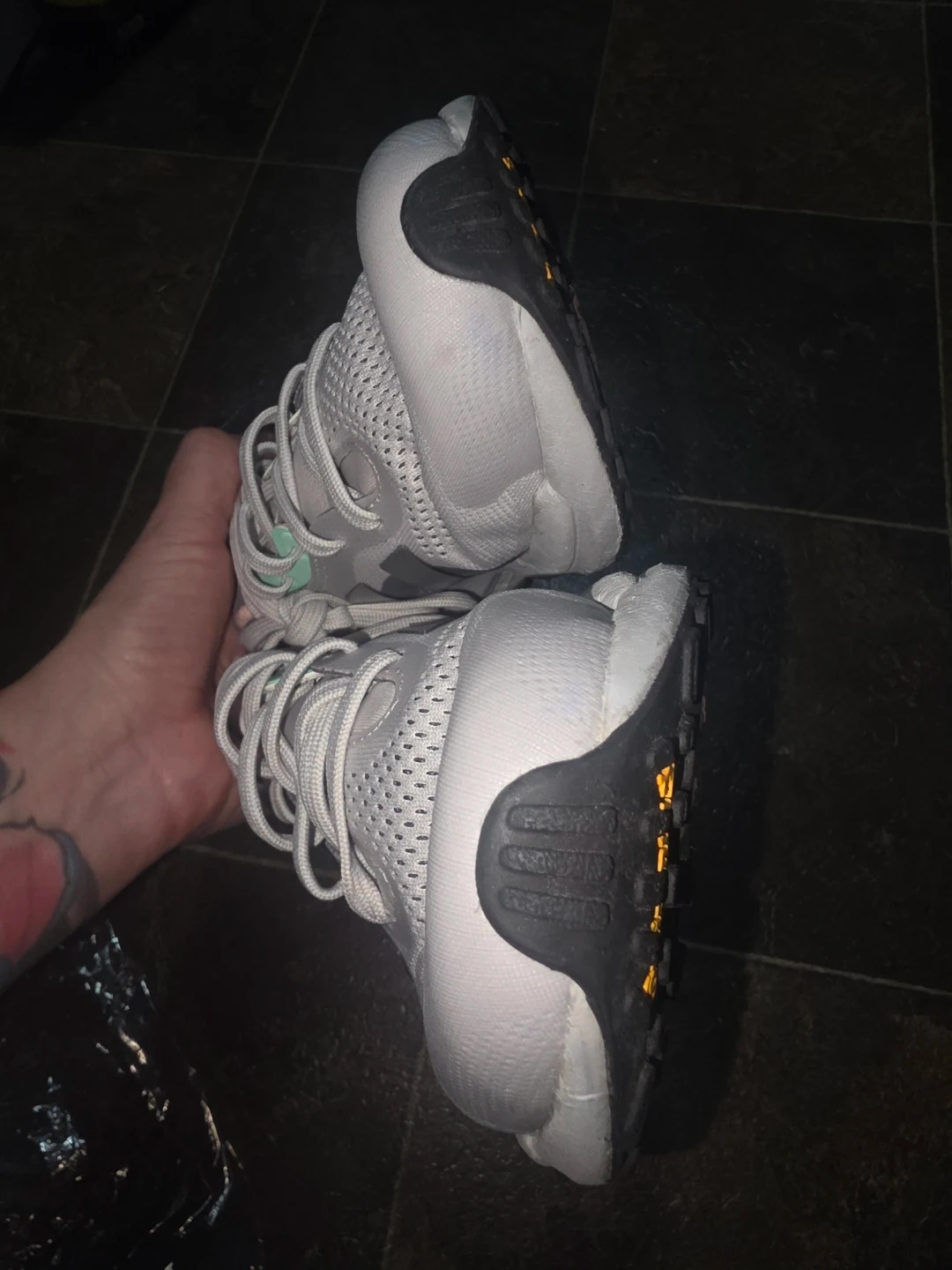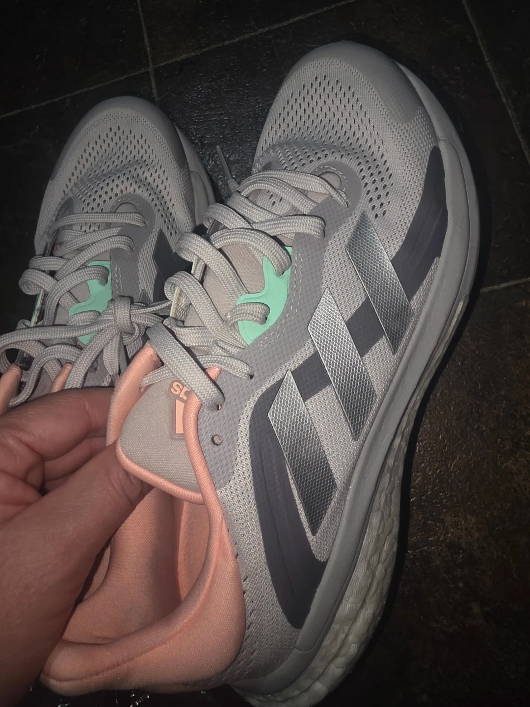 Selling a pair of Adidas SolarGlide ST running shoes. They are gray with peach and mint green accents. These shoes feature a STABLEFRAME for support and a Continental rubber outsole for great traction. Perfect for your next run!