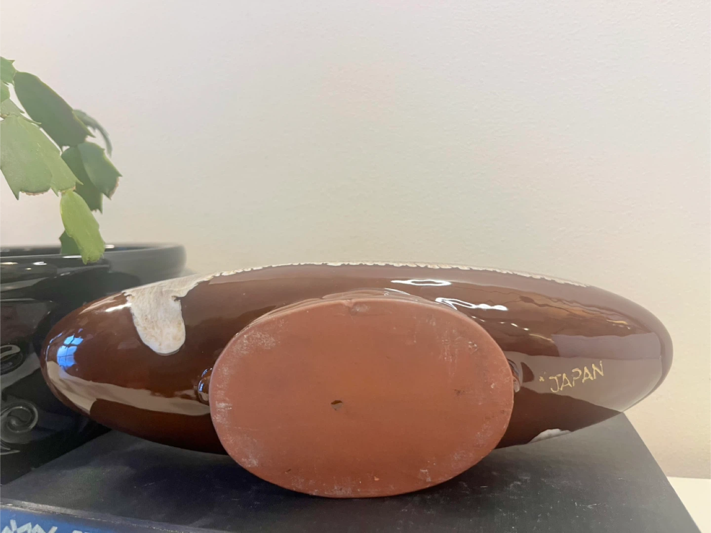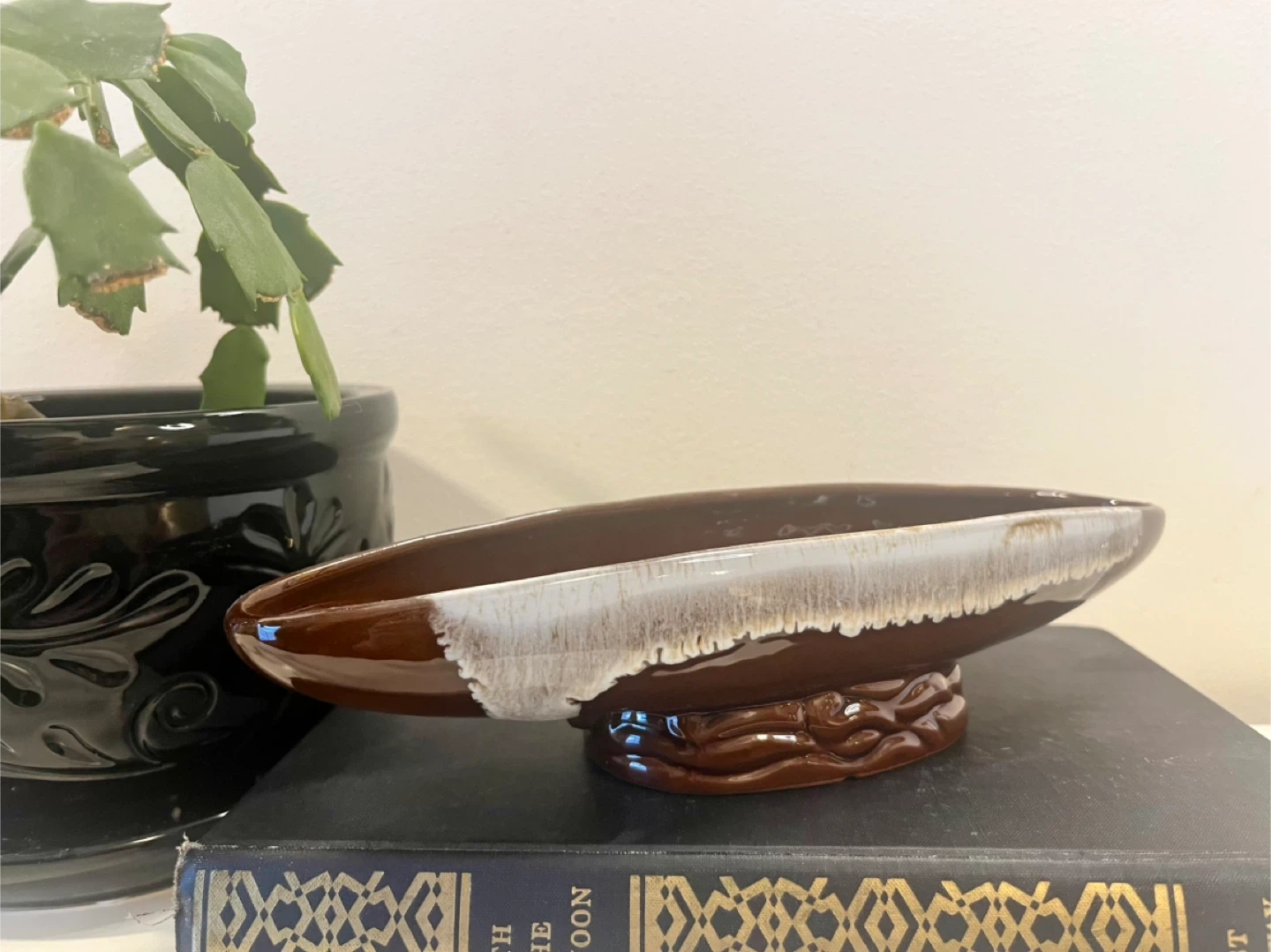 Selling a vintage brown drip glaze boat dish. It has a unique boat shape and a beautiful brown glaze with a white drip effect. The dish is in good condition and would make a great addition to any collection or home decor