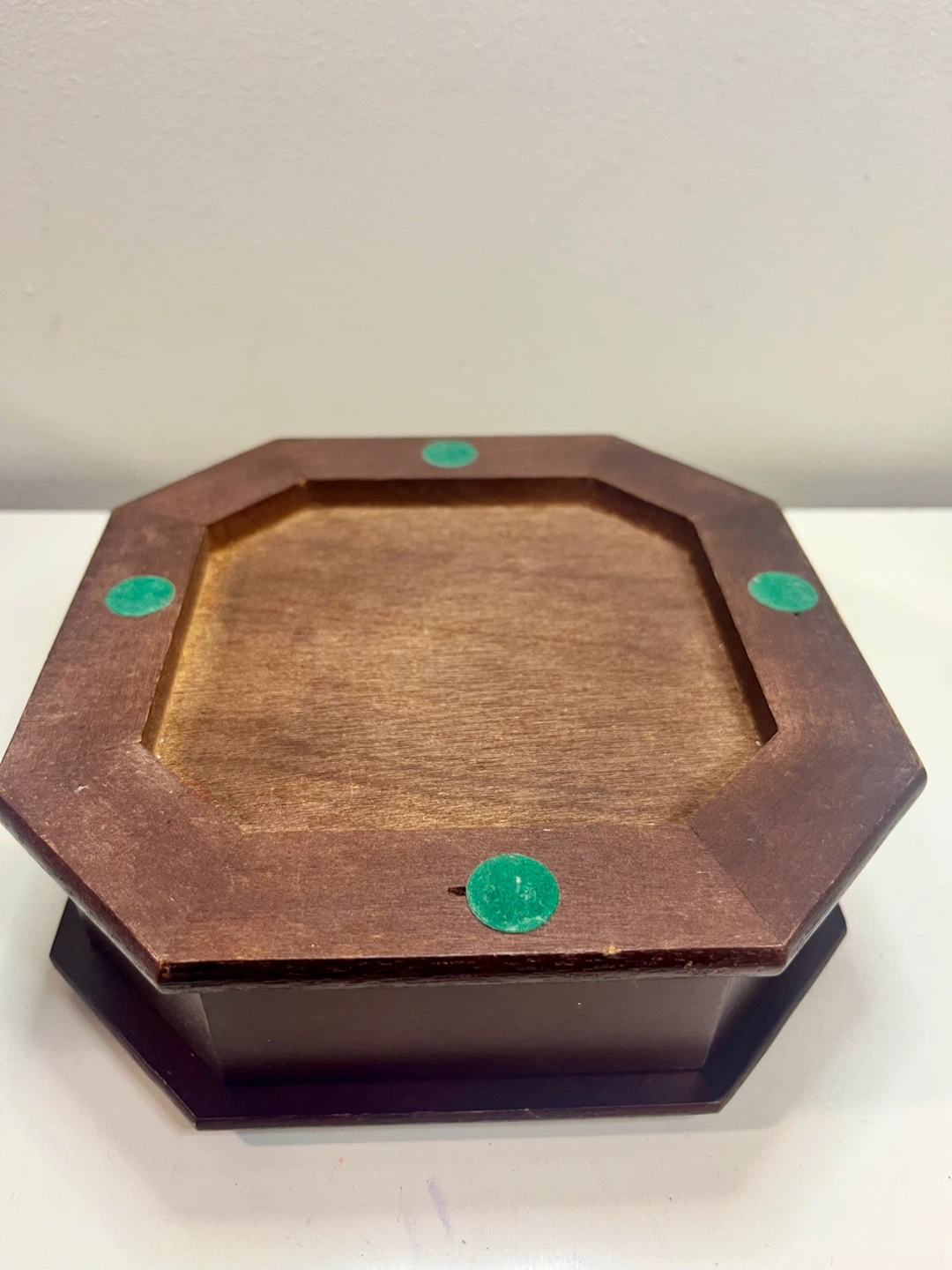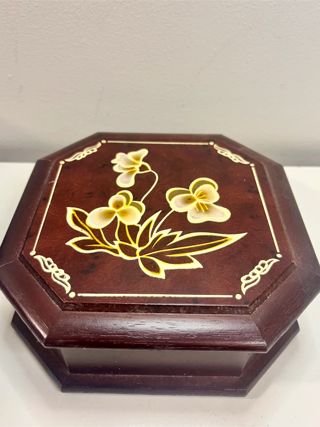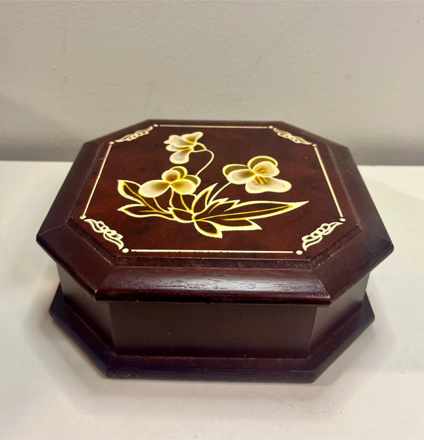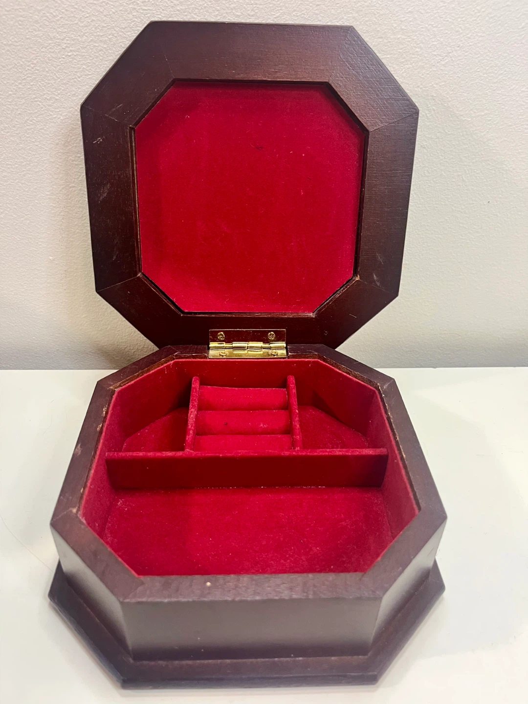 Selling a lovely vintage wooden jewelry box. It's octagonal shaped with a floral design on top and lined with red velvet inside. Perfect for storing your precious jewelry or trinkets!