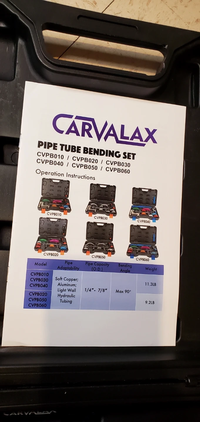High-quality Carvalax pipe/tube bender set, perfect for HVAC, plumbing, automotive, metal fabrication, copper/aluminum tubing, and hydraulic line work. Comes complete with multiple aluminum bending dies, cutter, adapters, handle, and hard carrying case.