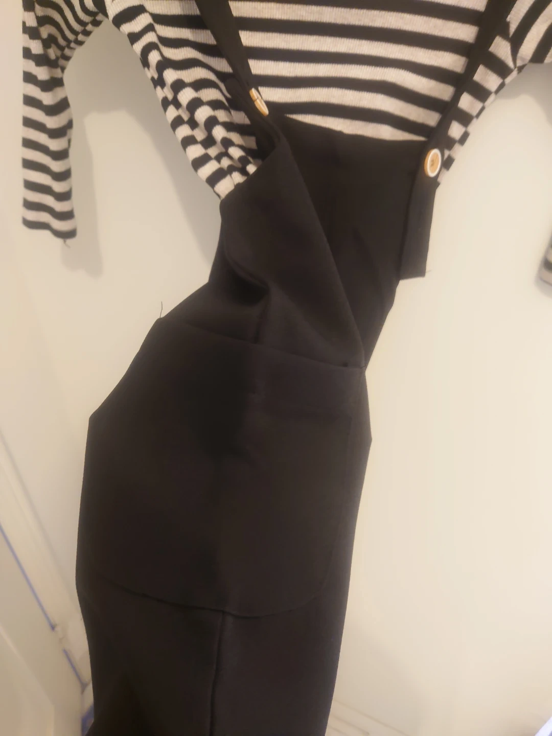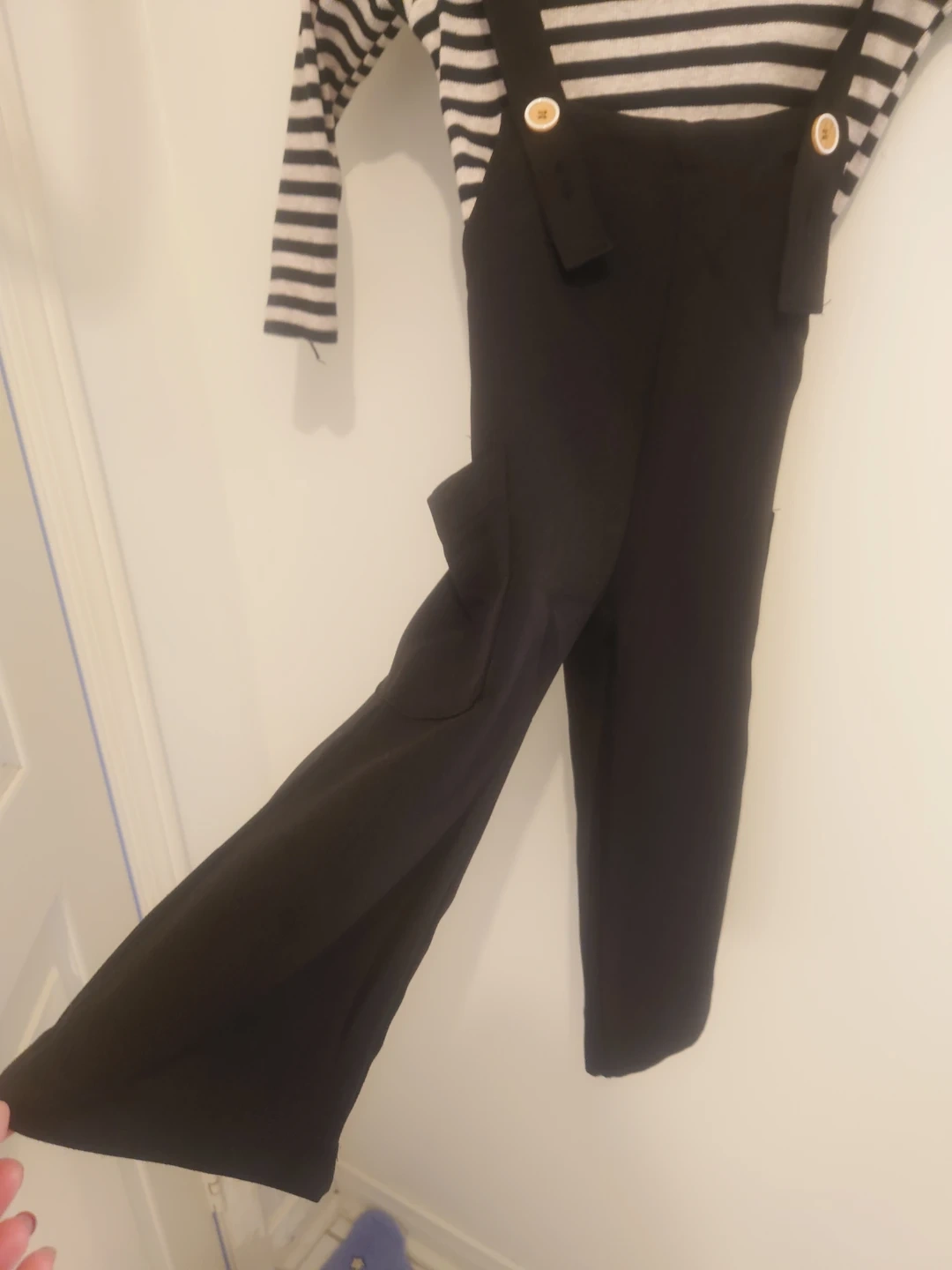 Cute kids' outfit featuring a striped long-sleeve top and black overalls. The overalls have button details. Perfect for a stylish and comfortable look for your little one!