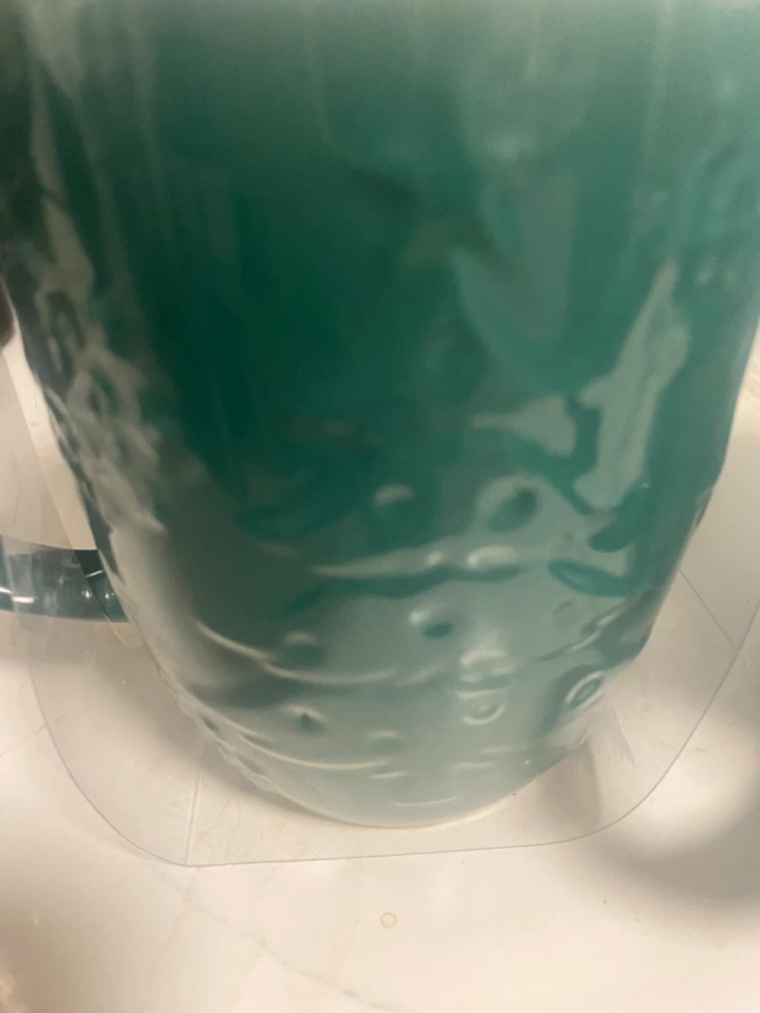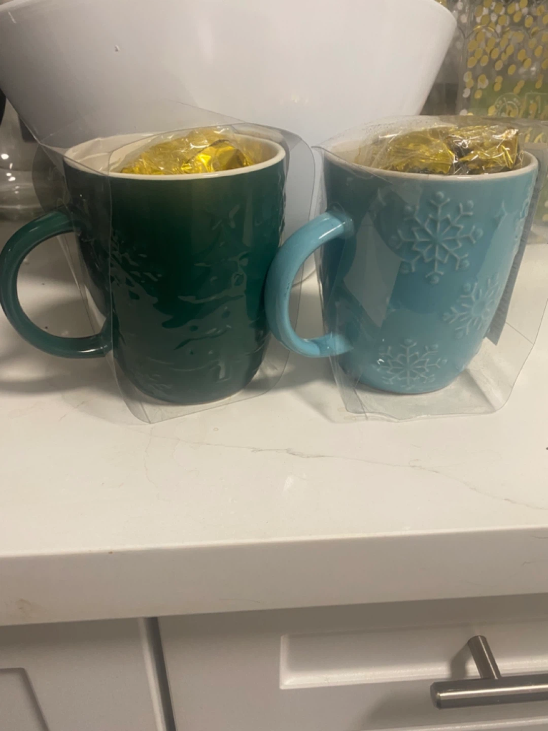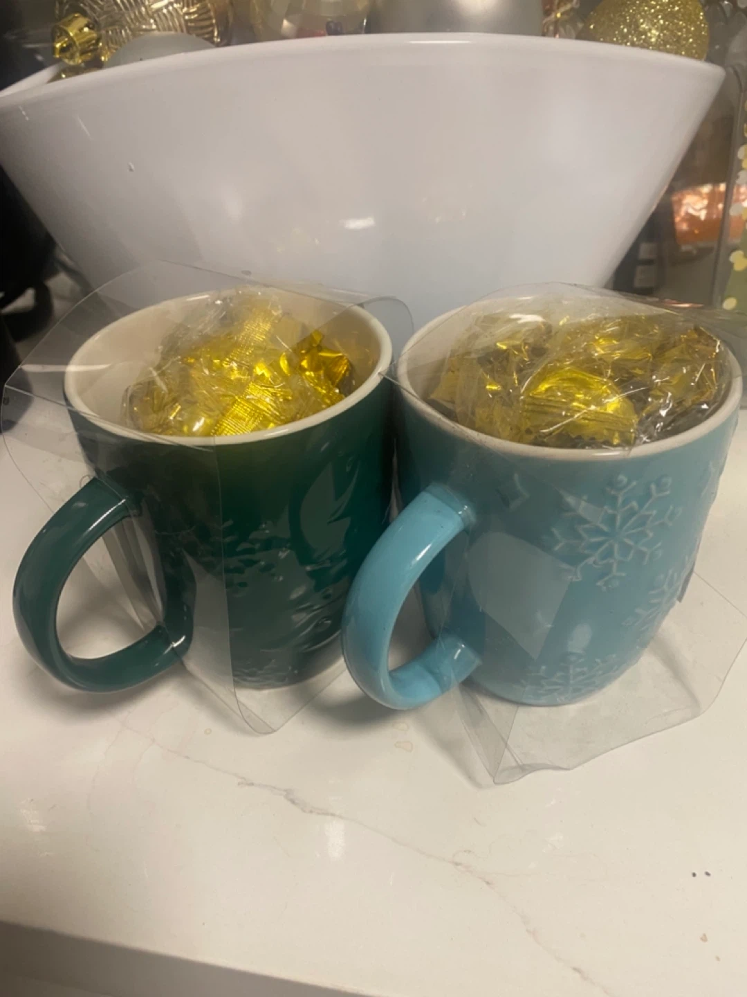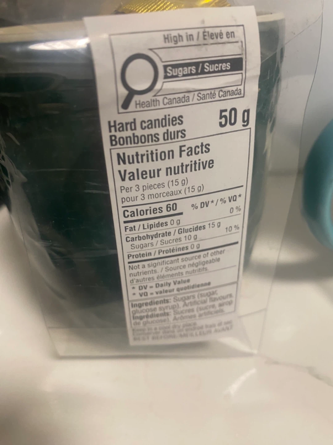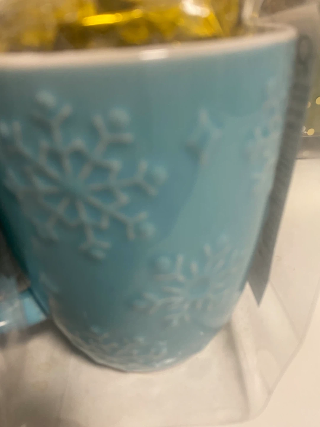 Mug filled with hard candies. The mug is a light blue colour with snowflake designs. The package states that the candies are 50g.