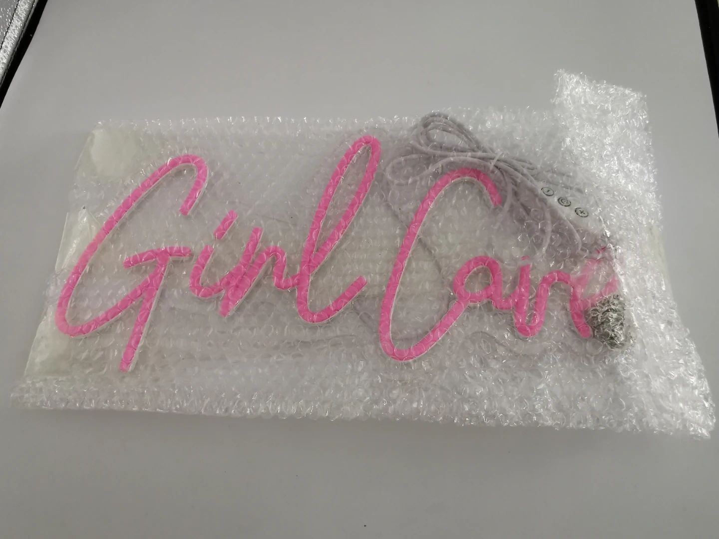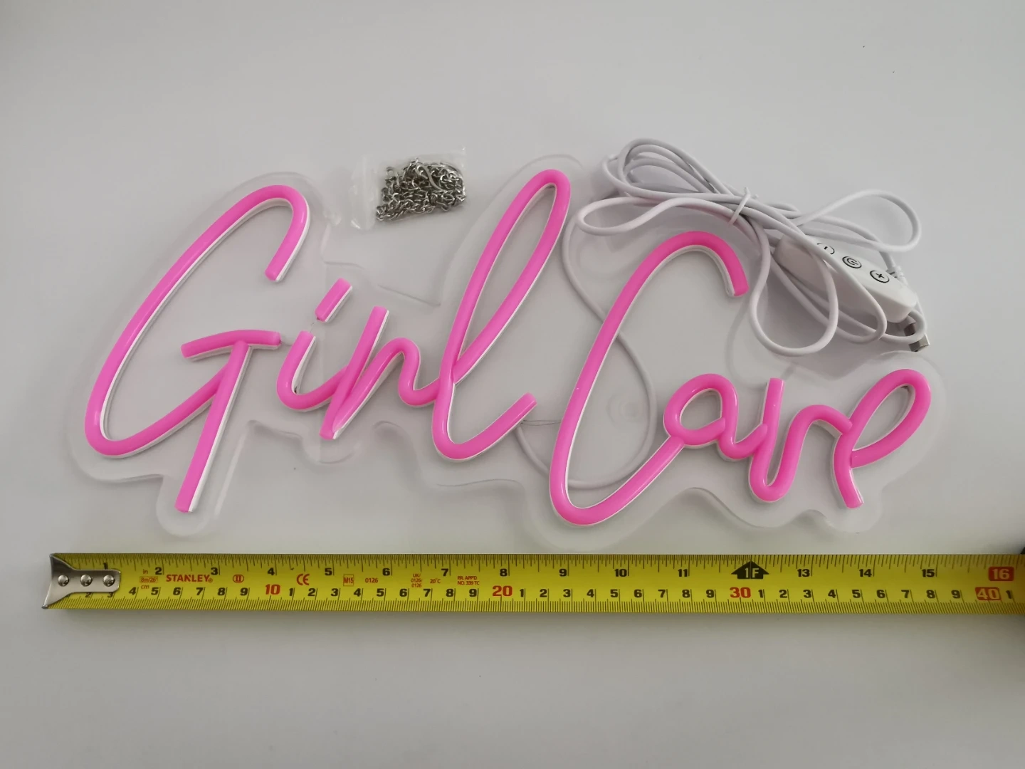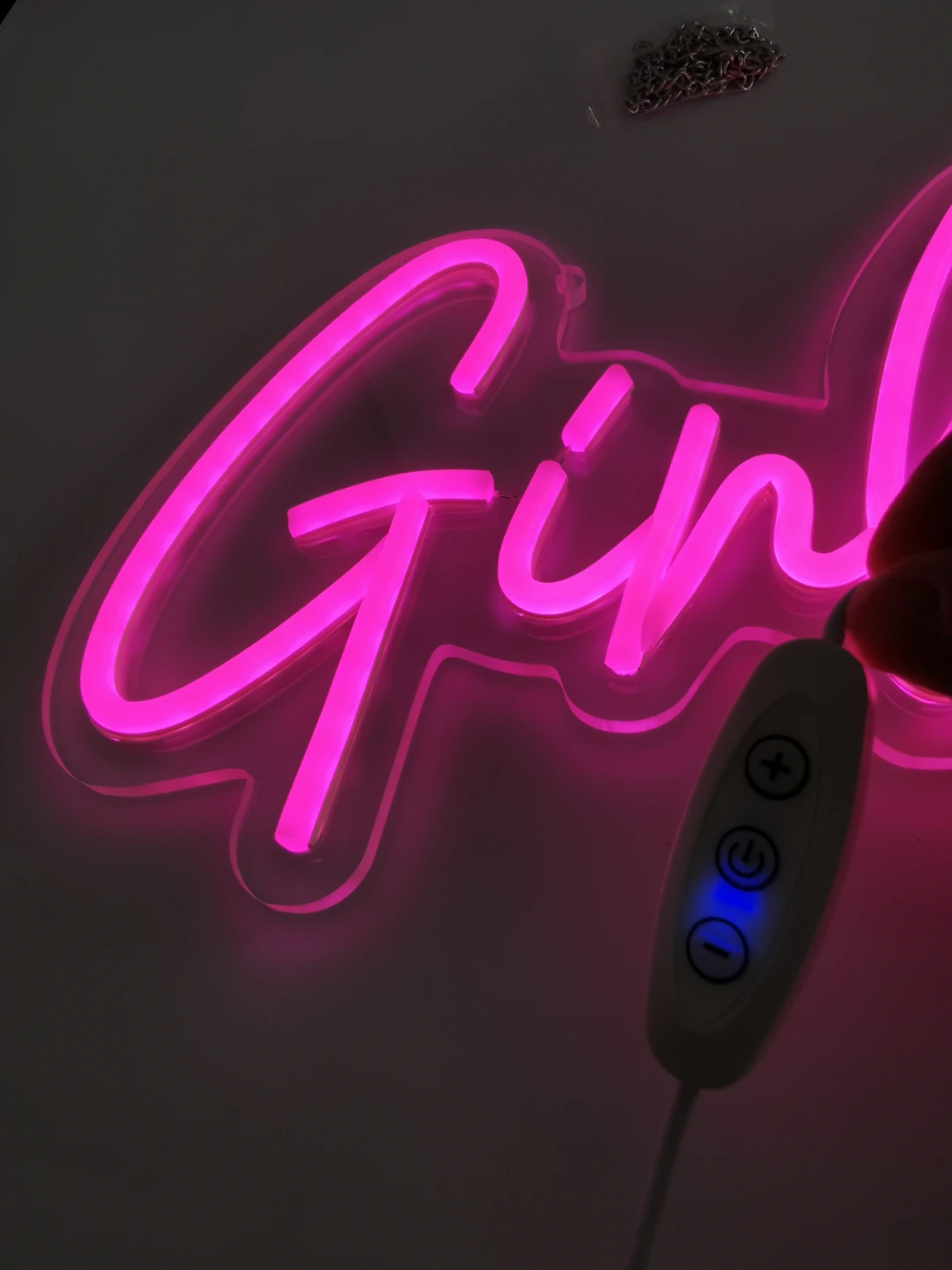 Brighten up your space with this eye-catching pink 'Girl Cave' LED neon sign! It's in new condition and ready to add a fun, vibrant touch to any room. It can be powered by USB and has a dimmer control attached.
