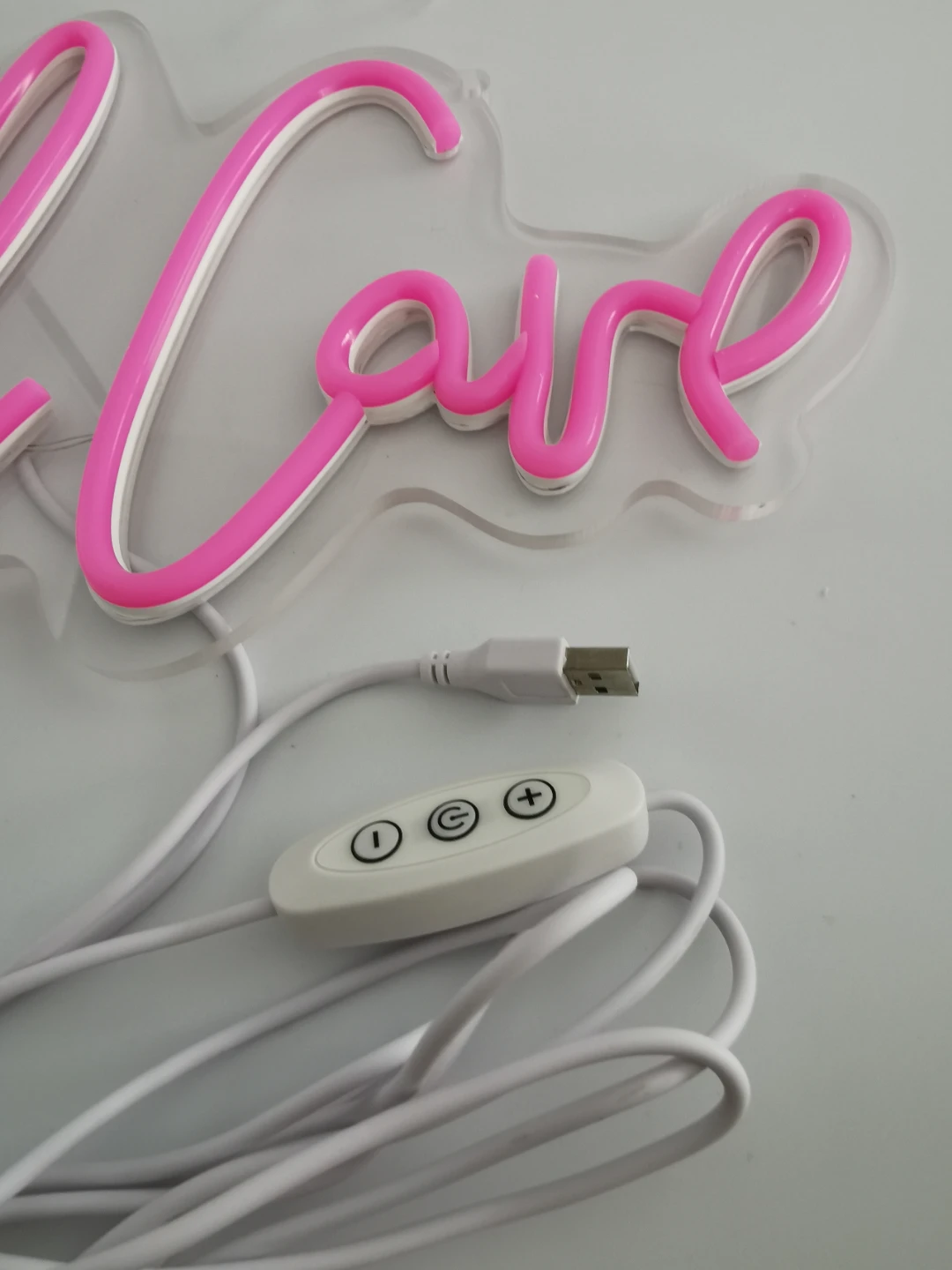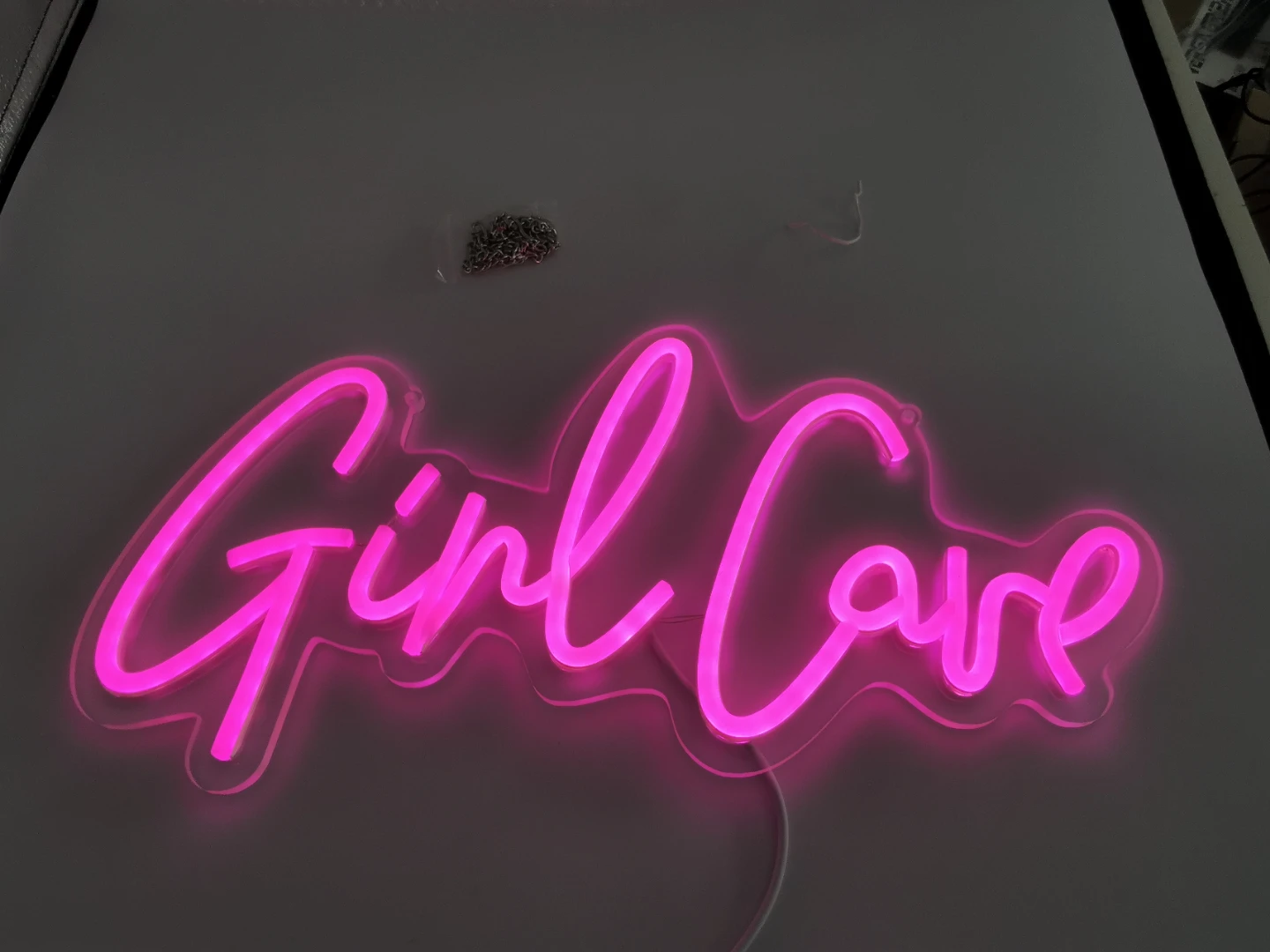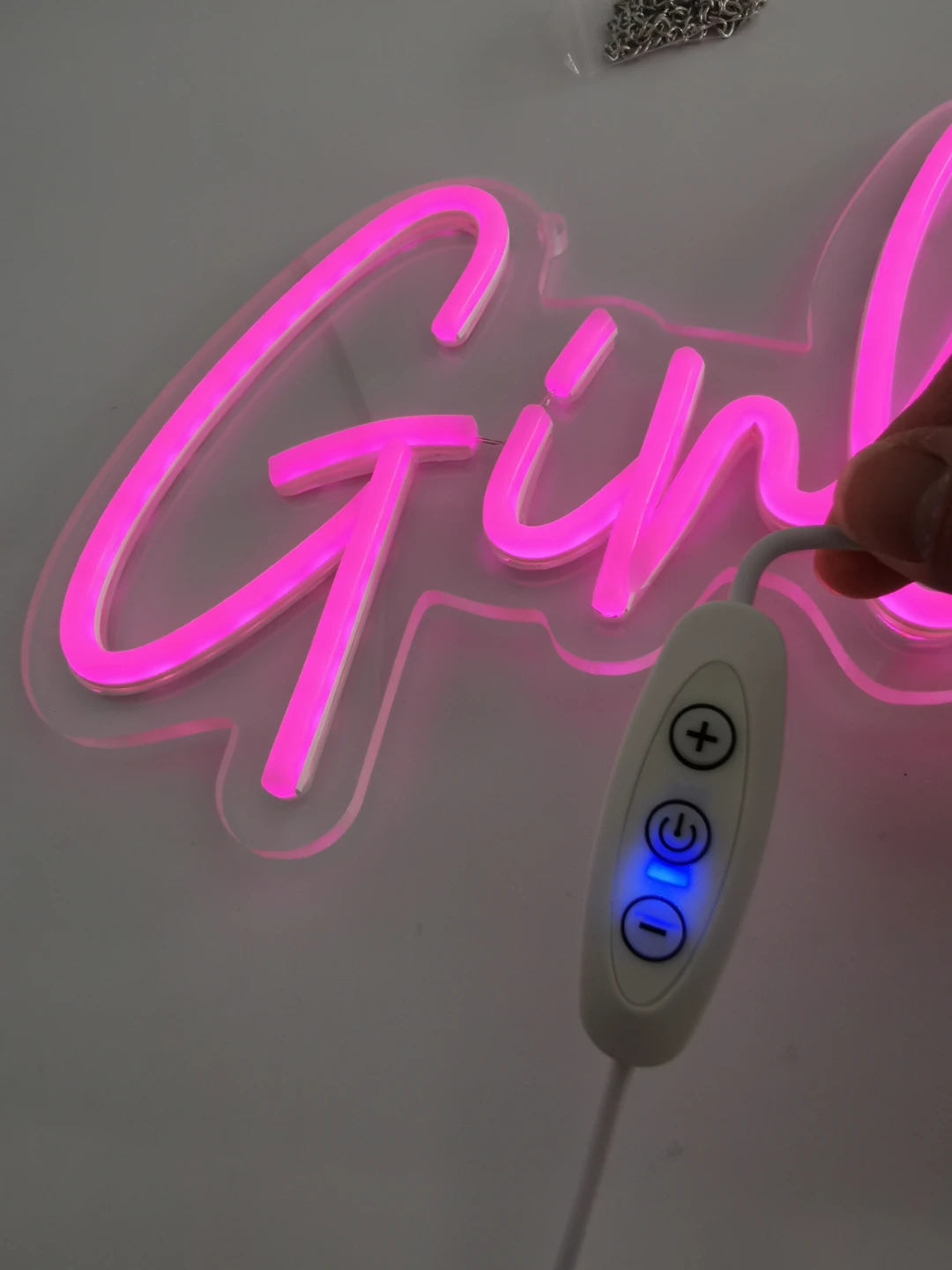 Brighten up your space with this eye-catching pink 'Girl Cave' LED neon sign! It's in new condition and ready to add a fun, vibrant touch to any room. It can be powered by USB and has a dimmer control attached.