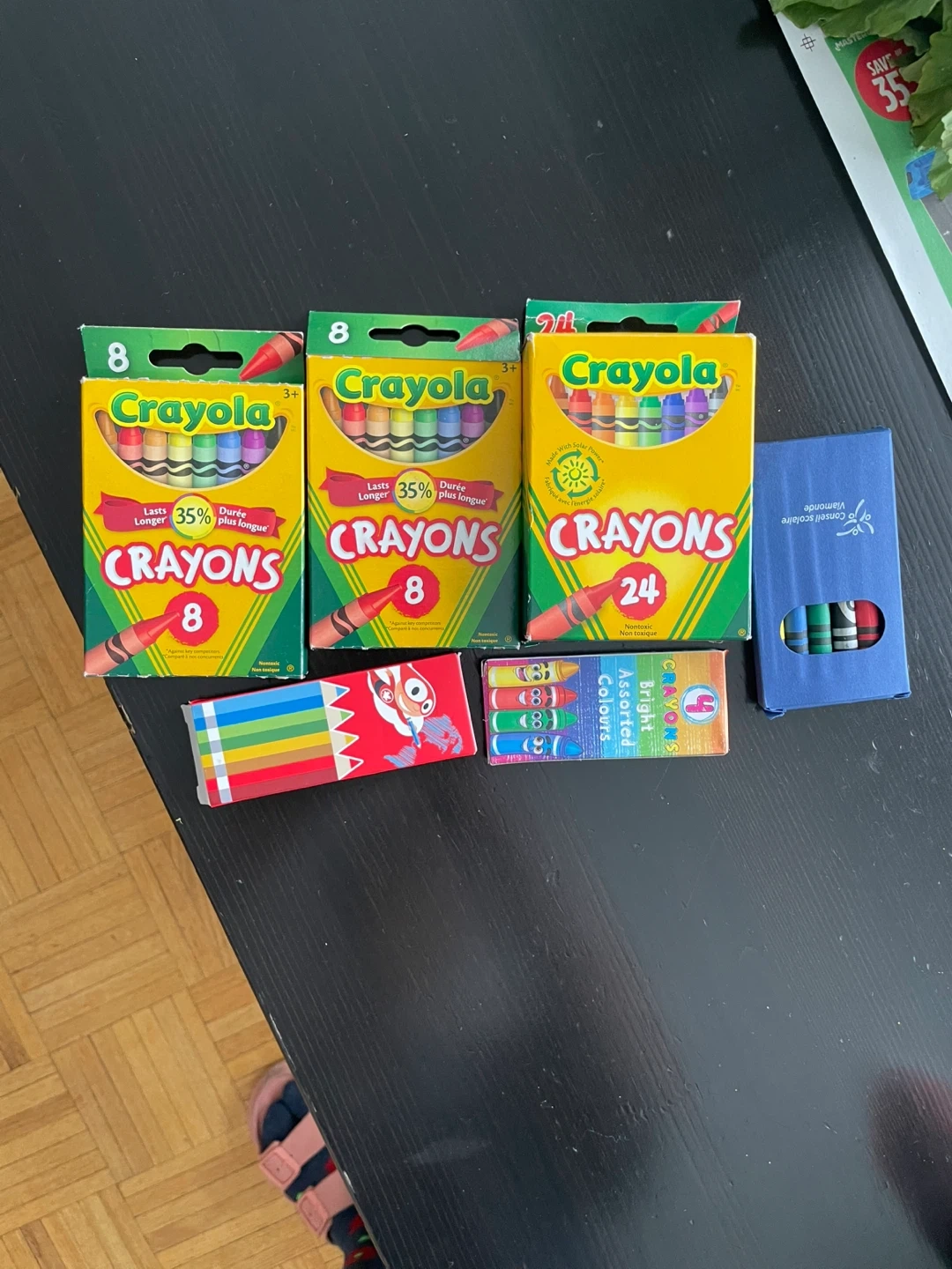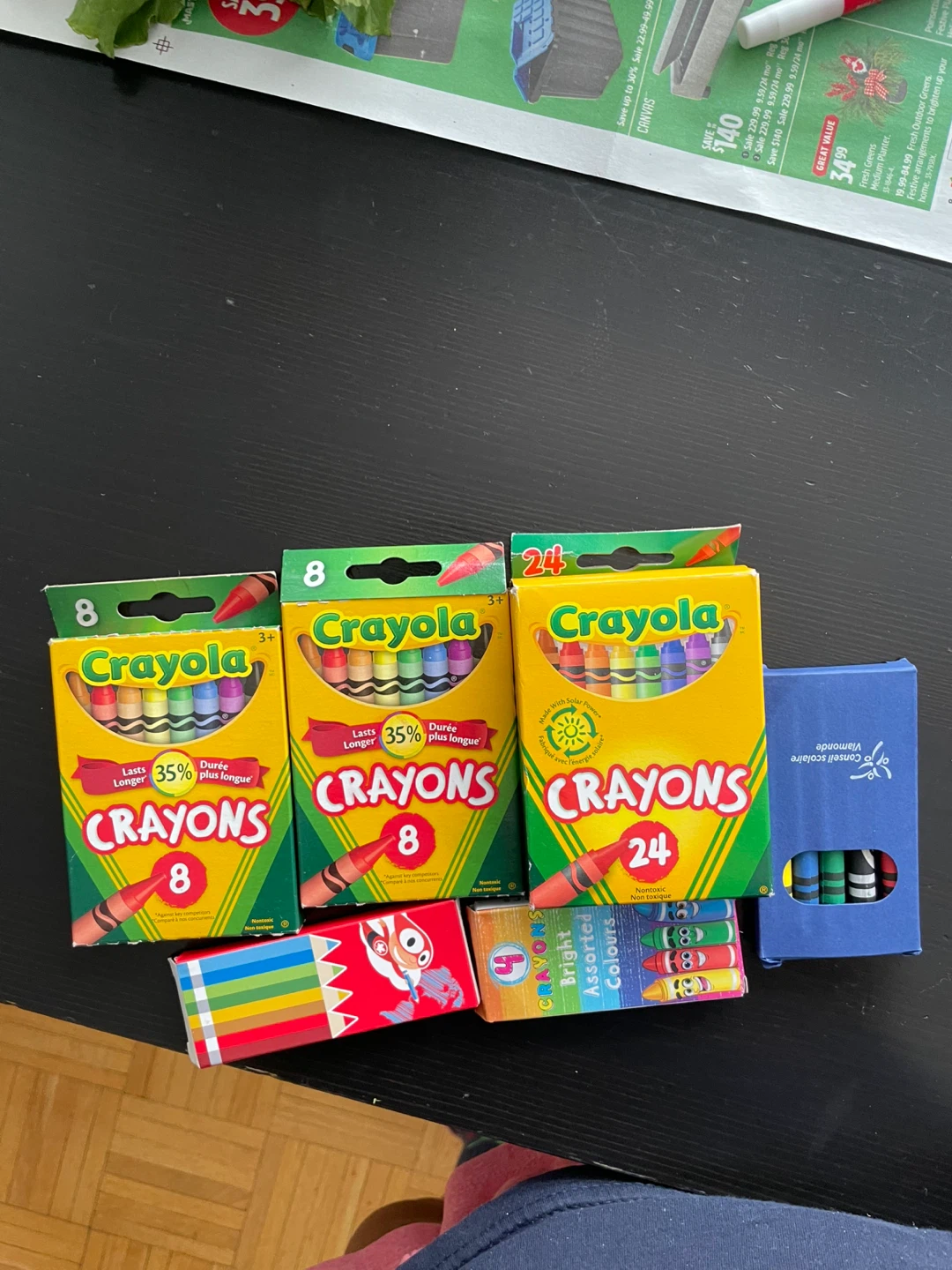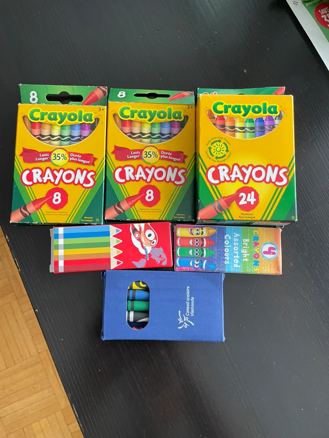 Selling a variety of Crayola crayons! There are three boxes of 8 crayons and one box of 24 crayons. Perfect for arts and crafts or school projects