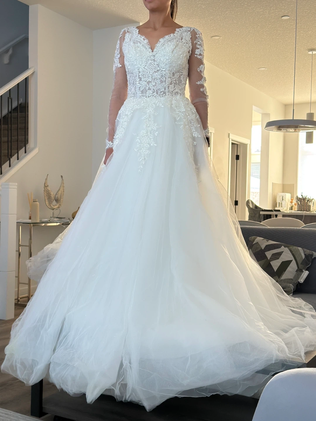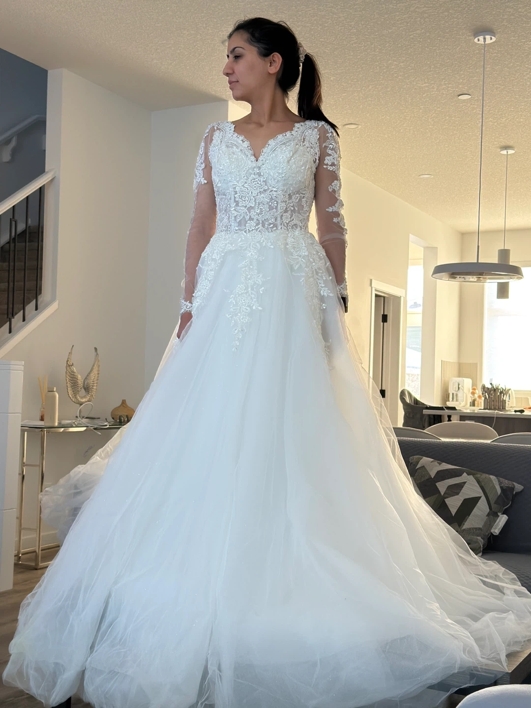 Selling a beautiful white wedding dress. It features delicate lace detailing and a flowing skirt. It's in great condition and ready for its special day! I got it for $2500 myself.