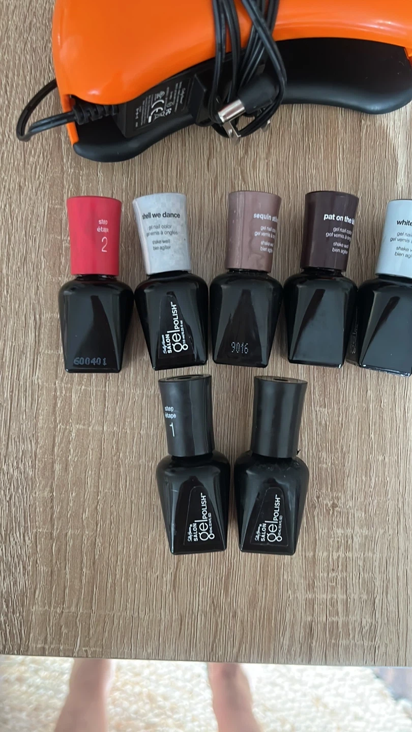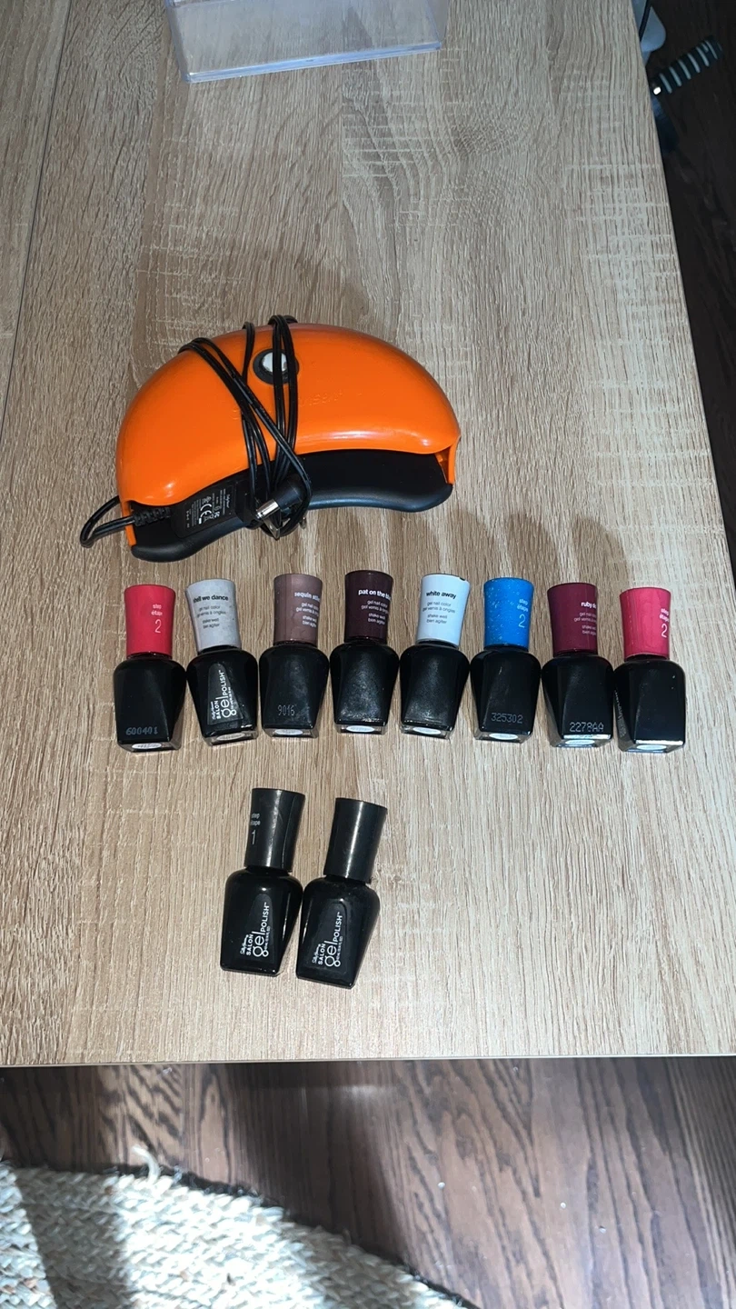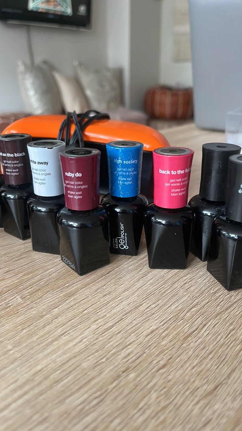 Selling a set of Salon Gel Polish nail colors! Includes a variety of shades to suit any style. Perfect for creating salon-quality manicures at home. This kit includes the LED lamp, the power, cord base and topcoat plus a variety of colors.!