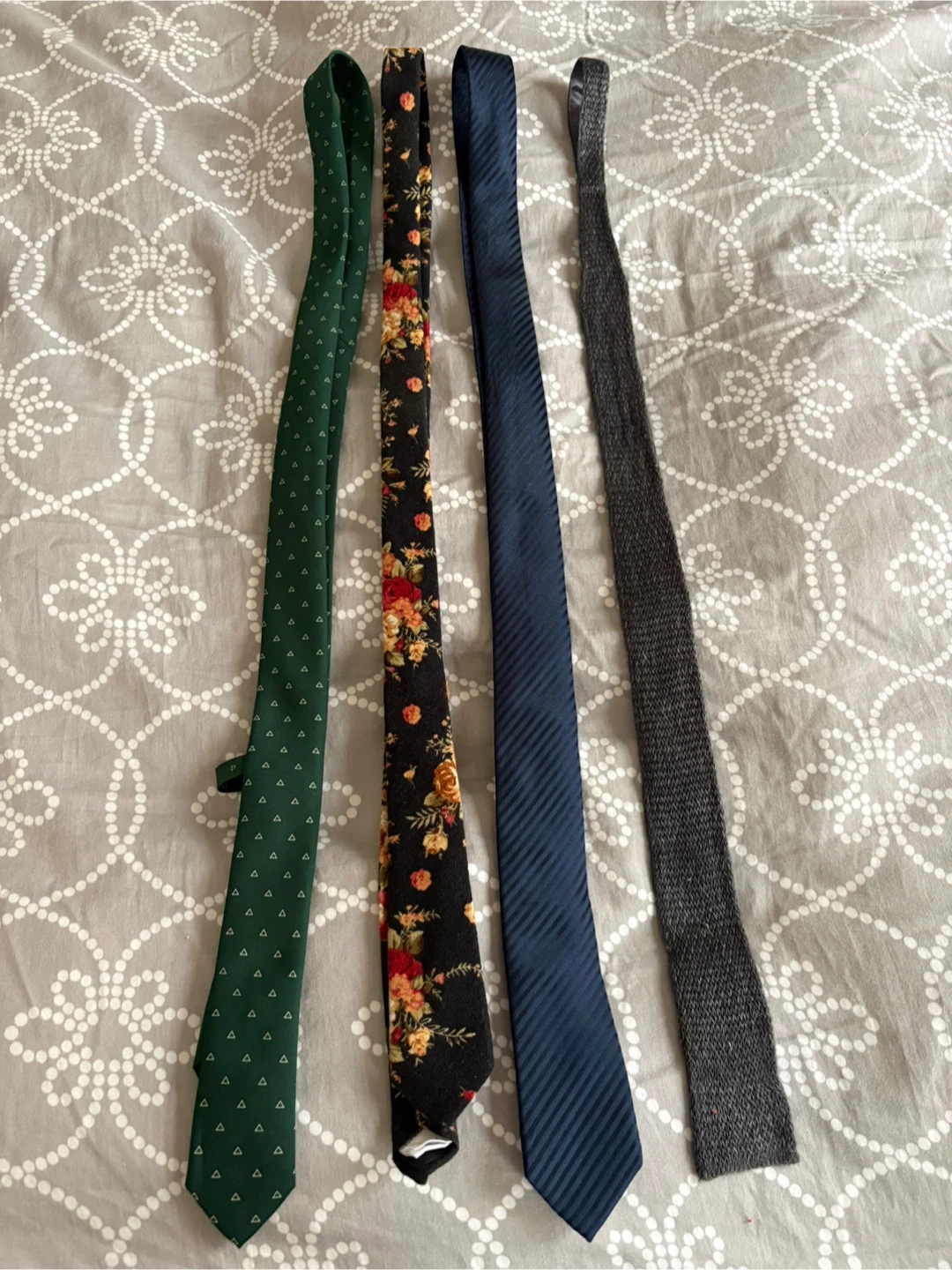 Selling a set of four ties in great condition! There's a green tie with a subtle pattern, a black tie with a floral design, a blue striped tie, and a grey textured tie. They're perfect for adding some variety to your wardrobe