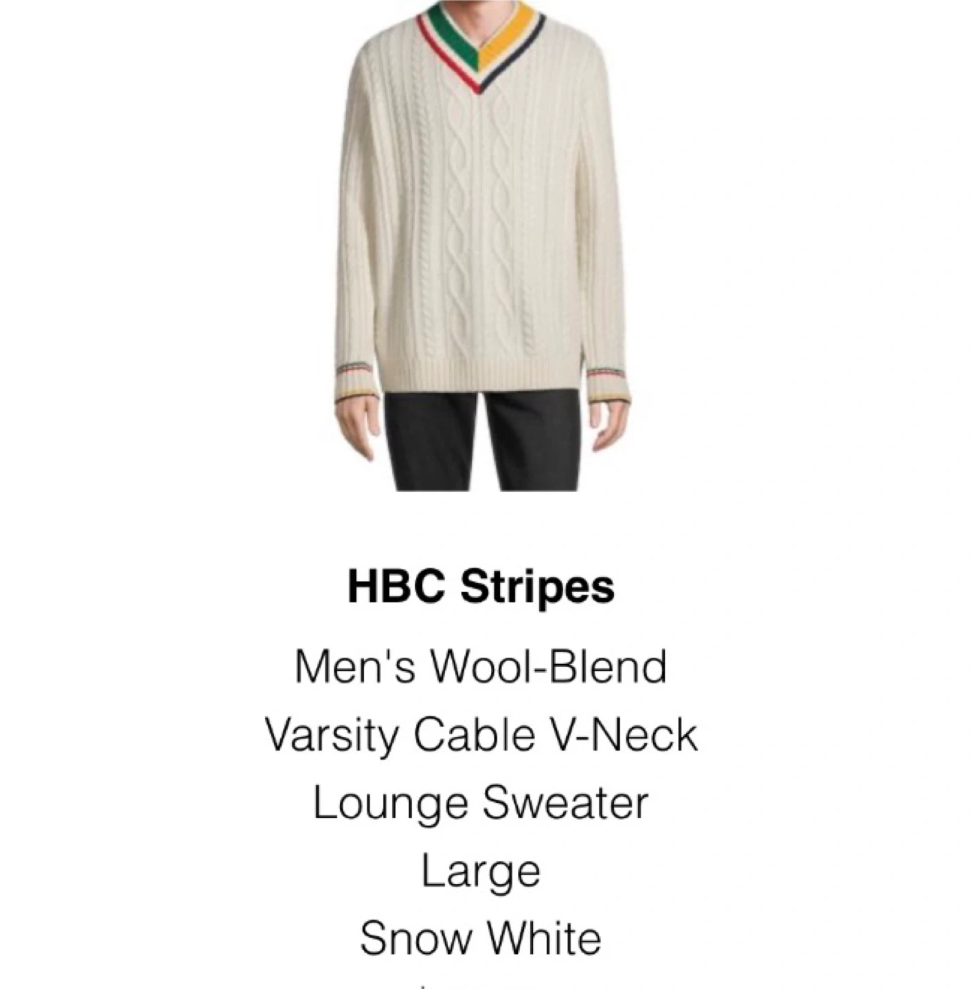 Selling a HBC Stripes men's wool-blend varsity cable v-neck sweater of the Canadian iconic HBC Stripes by Hudson’s Bay.
