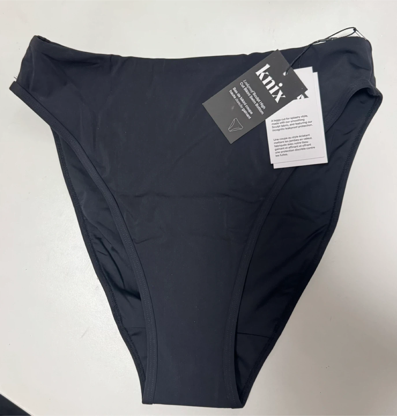 Brand new in original packaging, never worn. Knix Leakproof High Cut Bikini Bottom in size L/G. The body is composed of 68% nylon and 32% LYCRA spandex, while the lining is 85% nylon and 15% spandex. The gusset features Fresh Fix Technology, with different layers for optimal protection and comfort