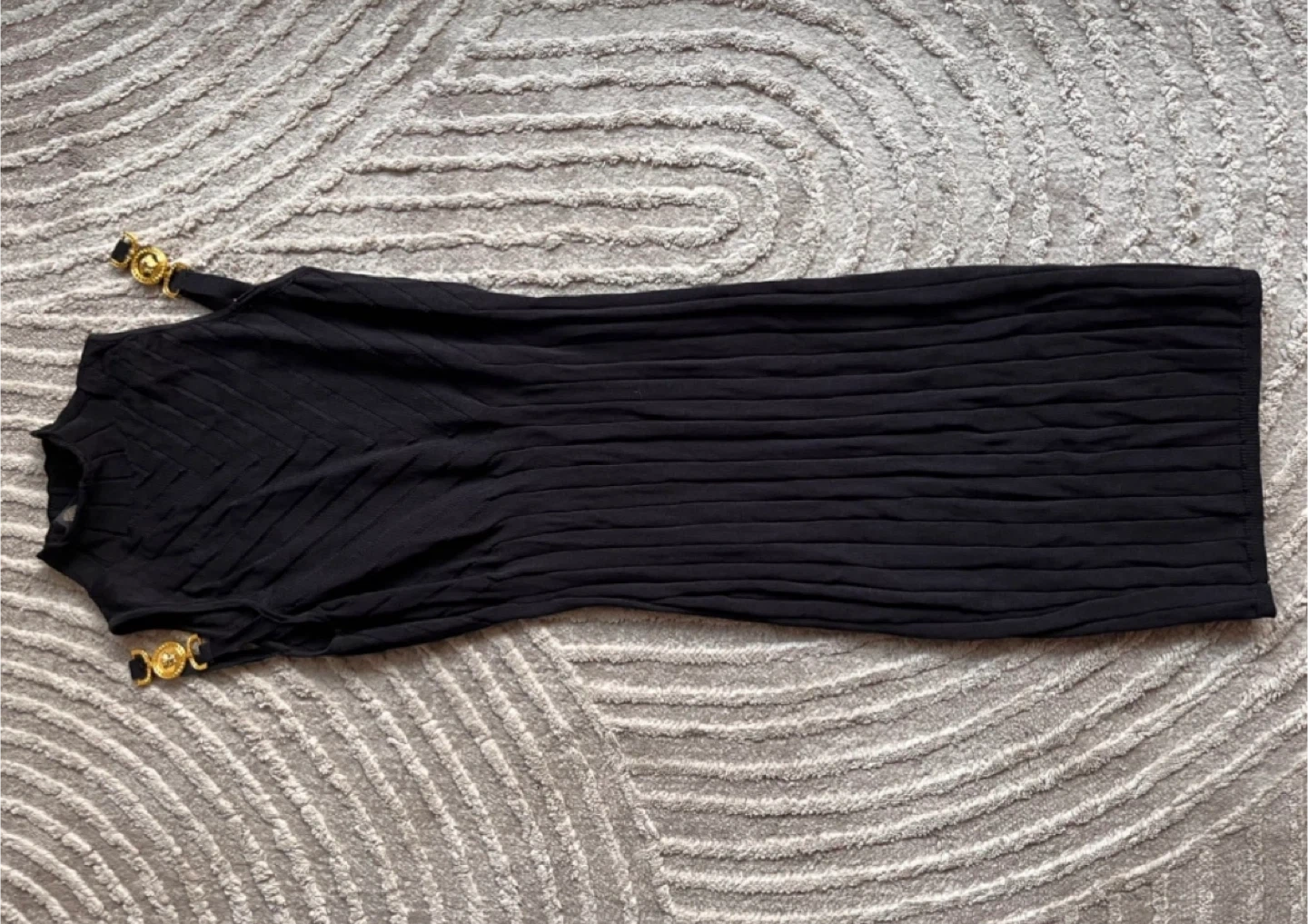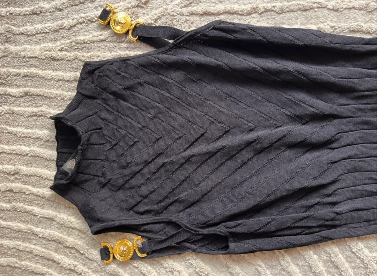 This is a beautiful black sleeveless dress. It features a unique design and gold detailing. The material is a comfortable knit. Perfect for a night out!