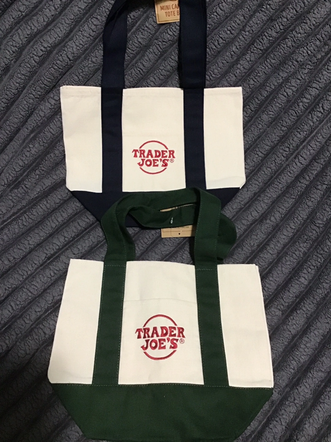 I have two brand new Trader Joe's mini canvas tote bags for sale! One is navy and the other is green. Perfect for small errands!