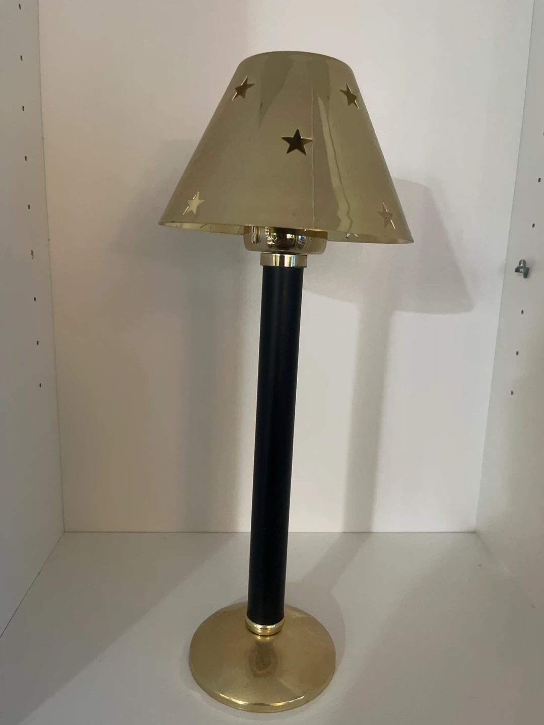 This is a stylish accent candleholder featuring a gold-coloured shade with star cutouts and a sleek black base. It would look great in any room!