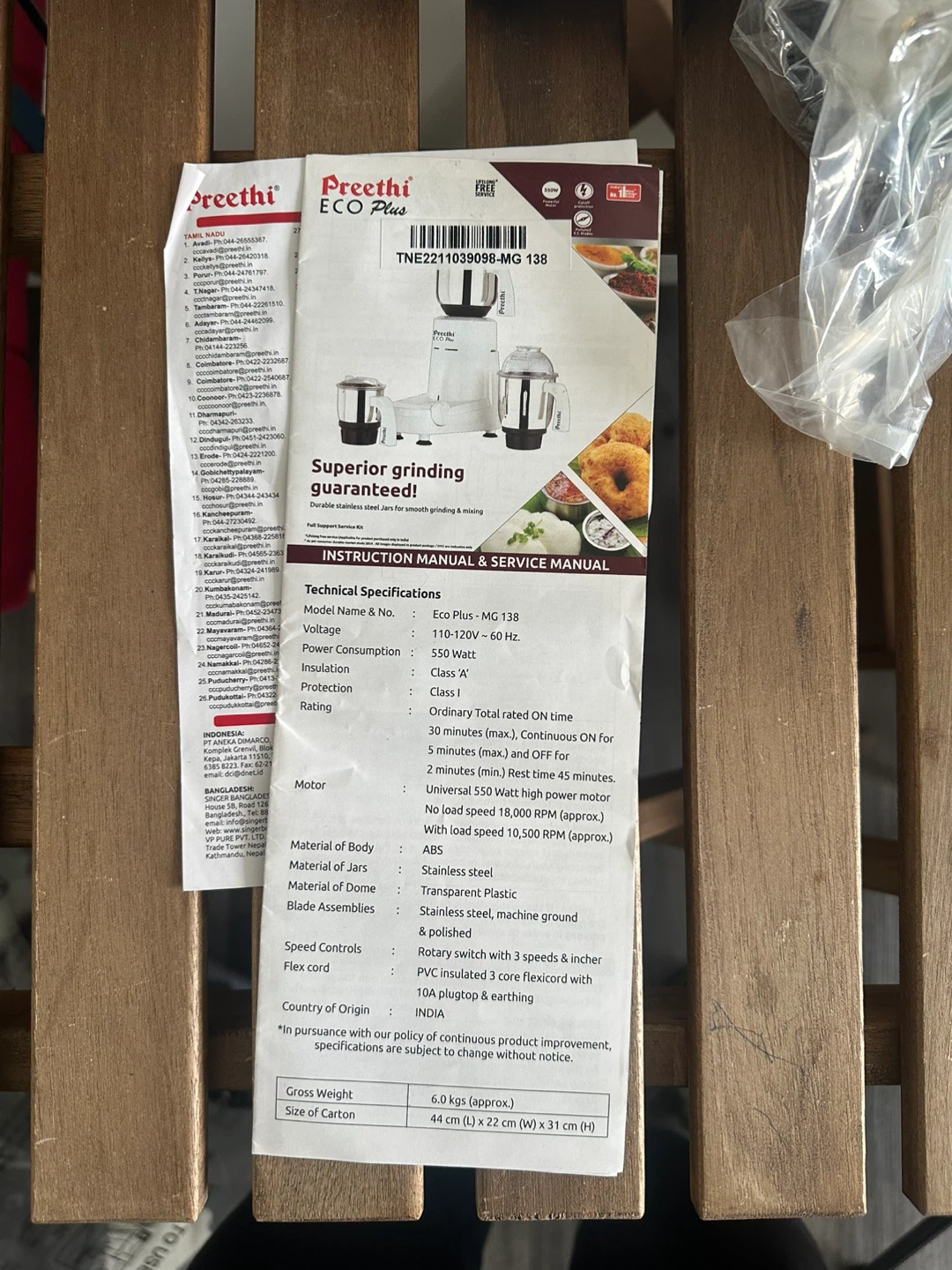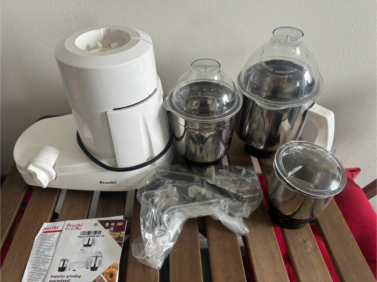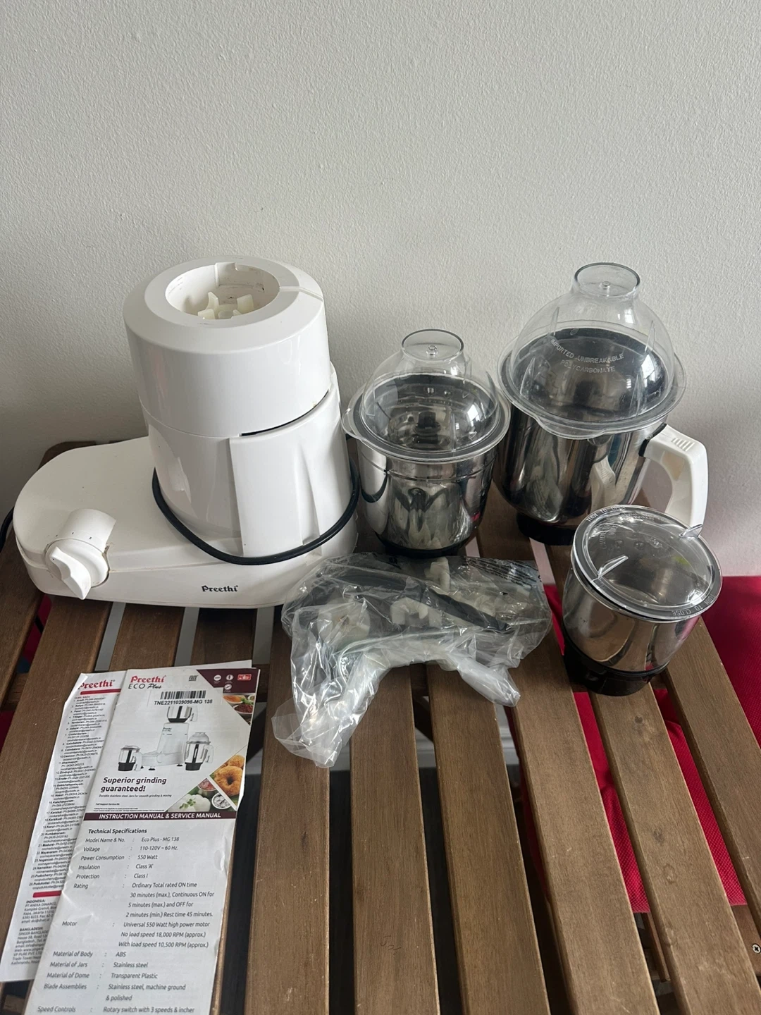 Selling a Preethi Eco Plus MG 138 mixer grinder! It comes with multiple stainless steel jars and transparent plastic domes. It also includes the instruction manual. It operates at 110-120V and consumes 550 watts.