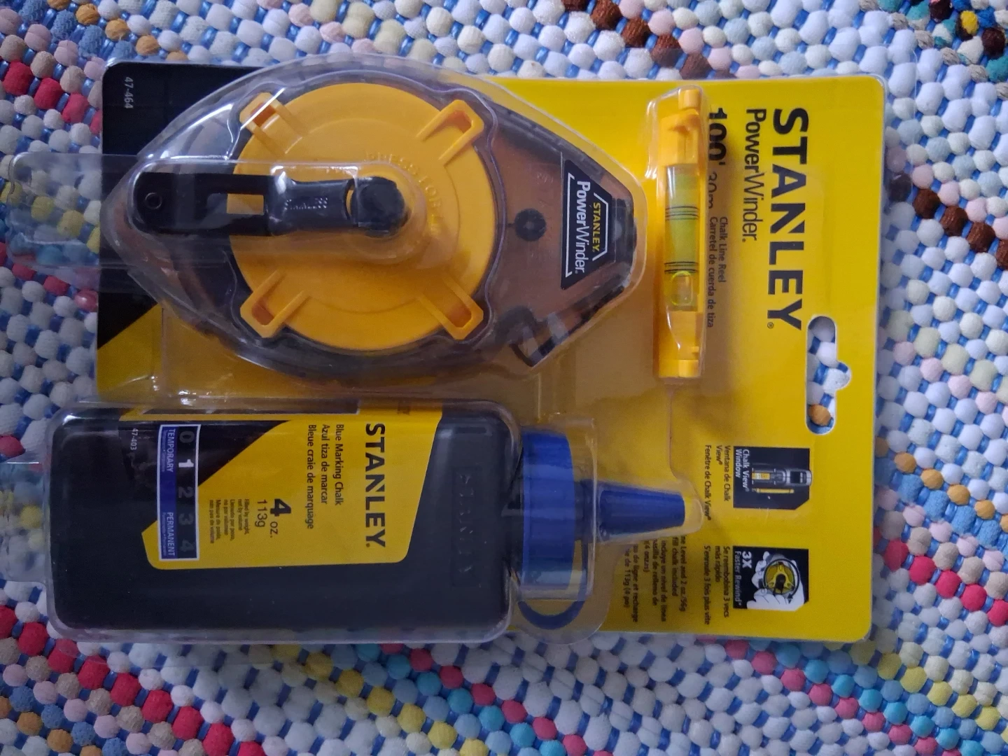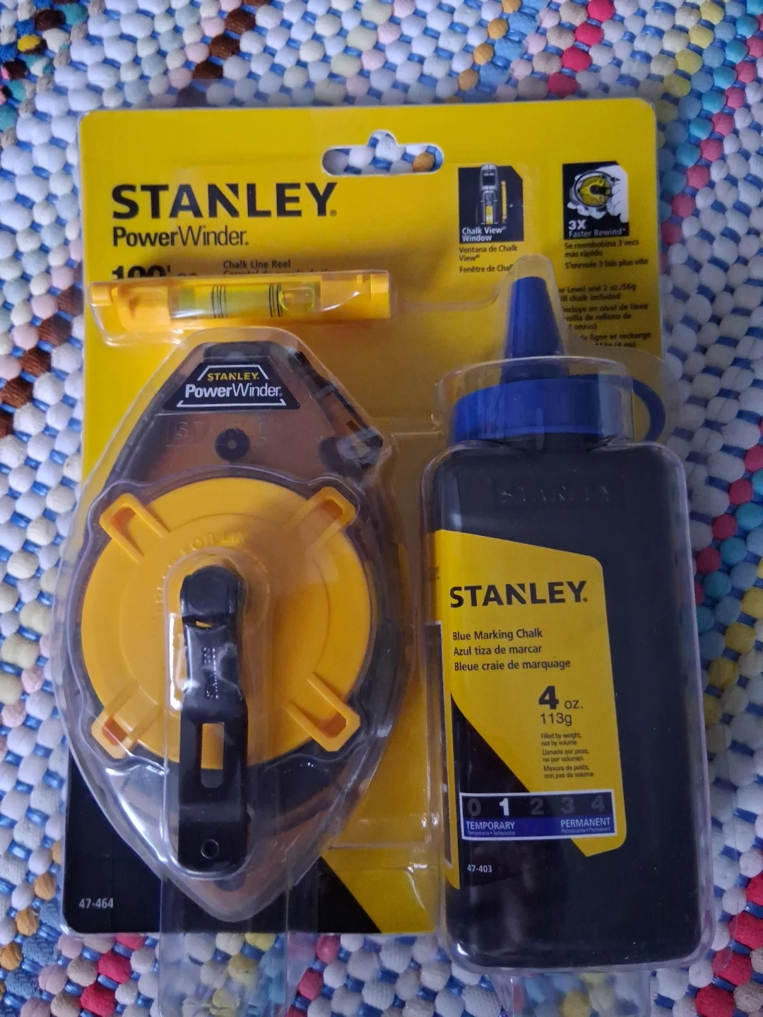 BOXING DAY. Brrand new Stanley PowerWinder Chalk Line Reel Kit! It comes with chalk and a level. The chalk bottle holds 4oz. The reel holds up to 2 oz of chalk.