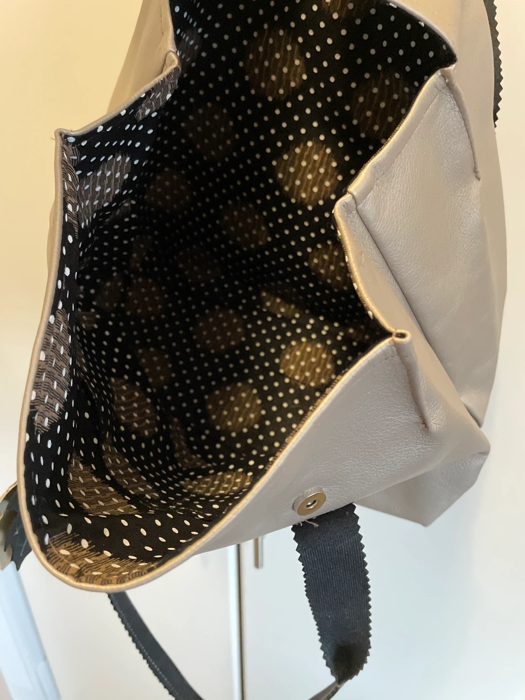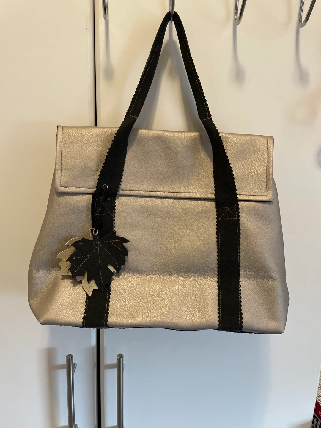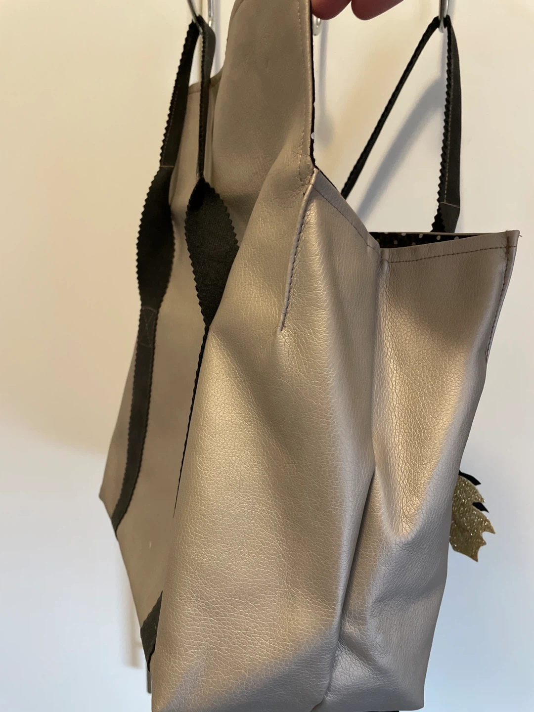 Here's a cute silver tote bag! It has black straps and a fun leaf charm. The inside has a black and white polka dot lining. It's about 17 inches wide and 11 inches tall, perfect for carrying your everyday essentials