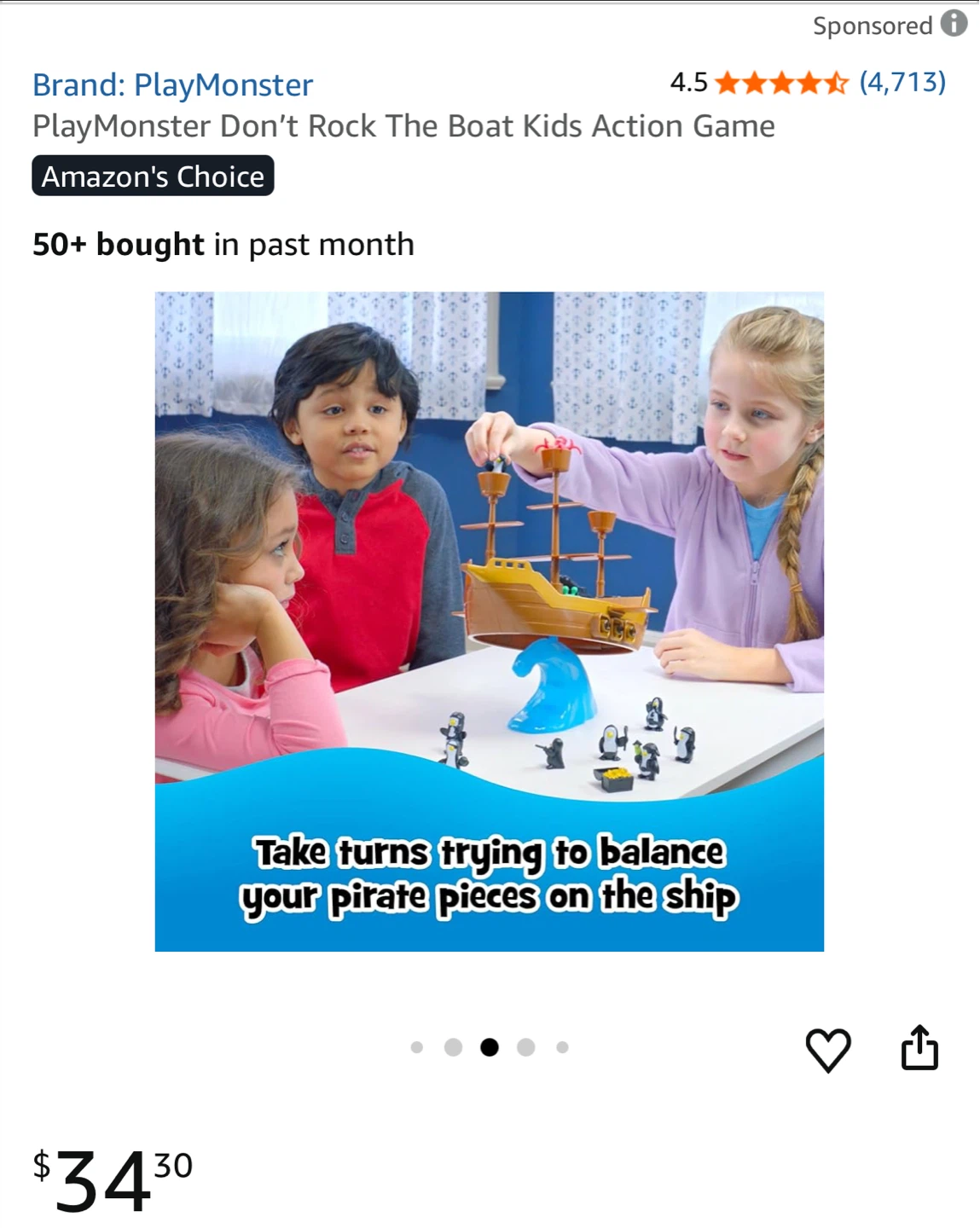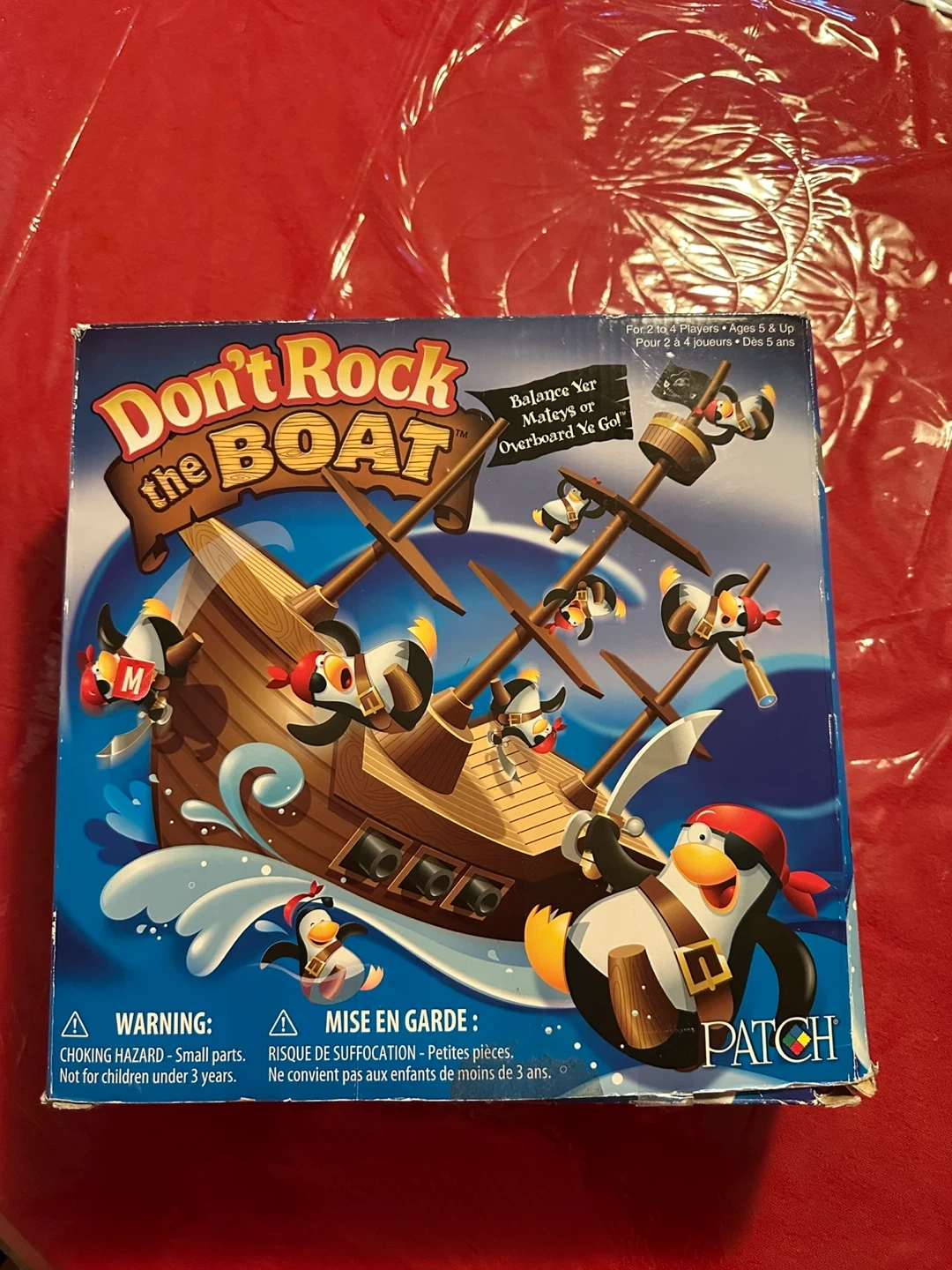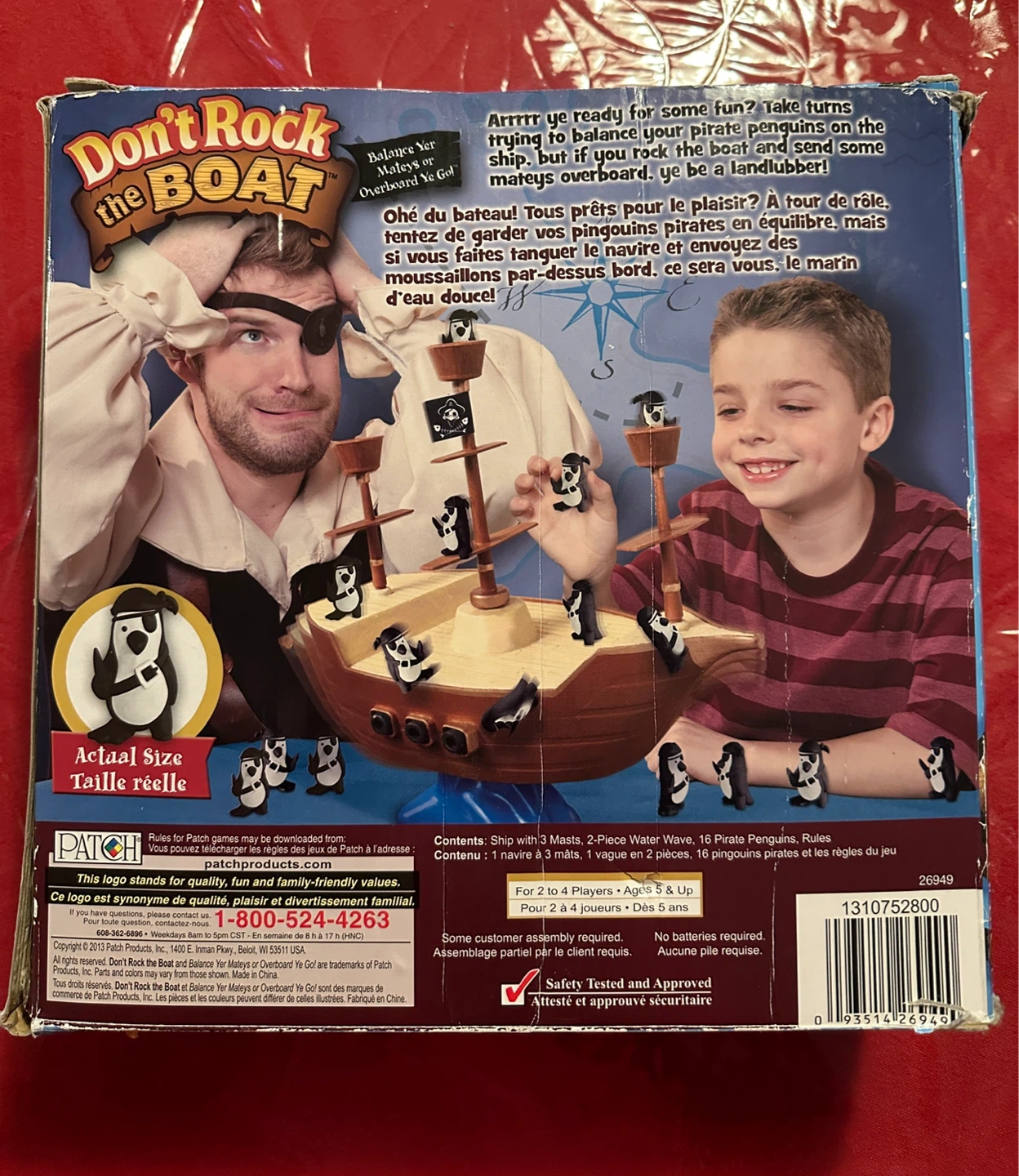 Get ready for some family fun with the Don't Rock the Boat game by Patch! This game is for 2 to 4 players, ages 5 and up. The box includes the ship, 3 mast, 1 piece water wave, 13 pirate penguins.