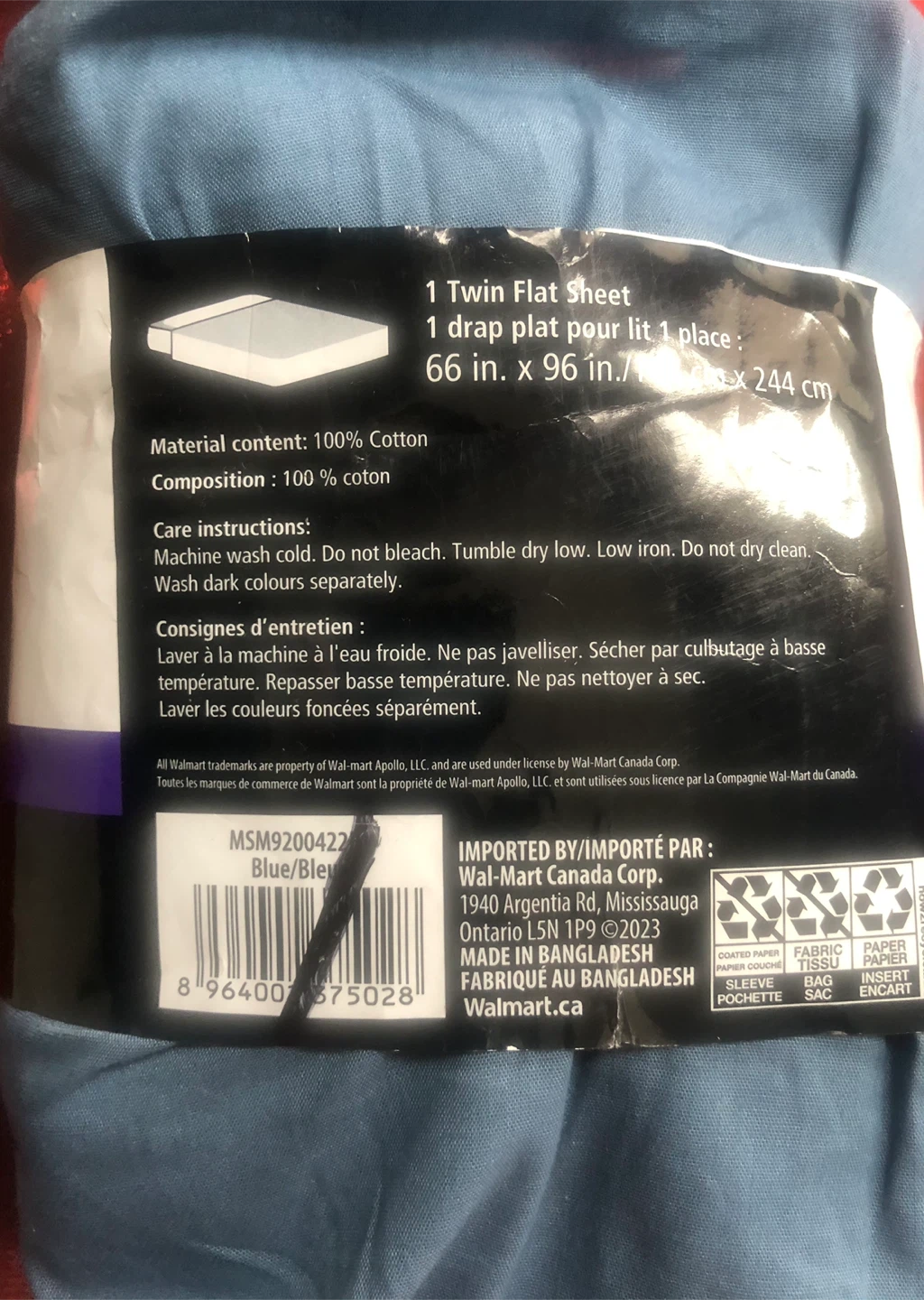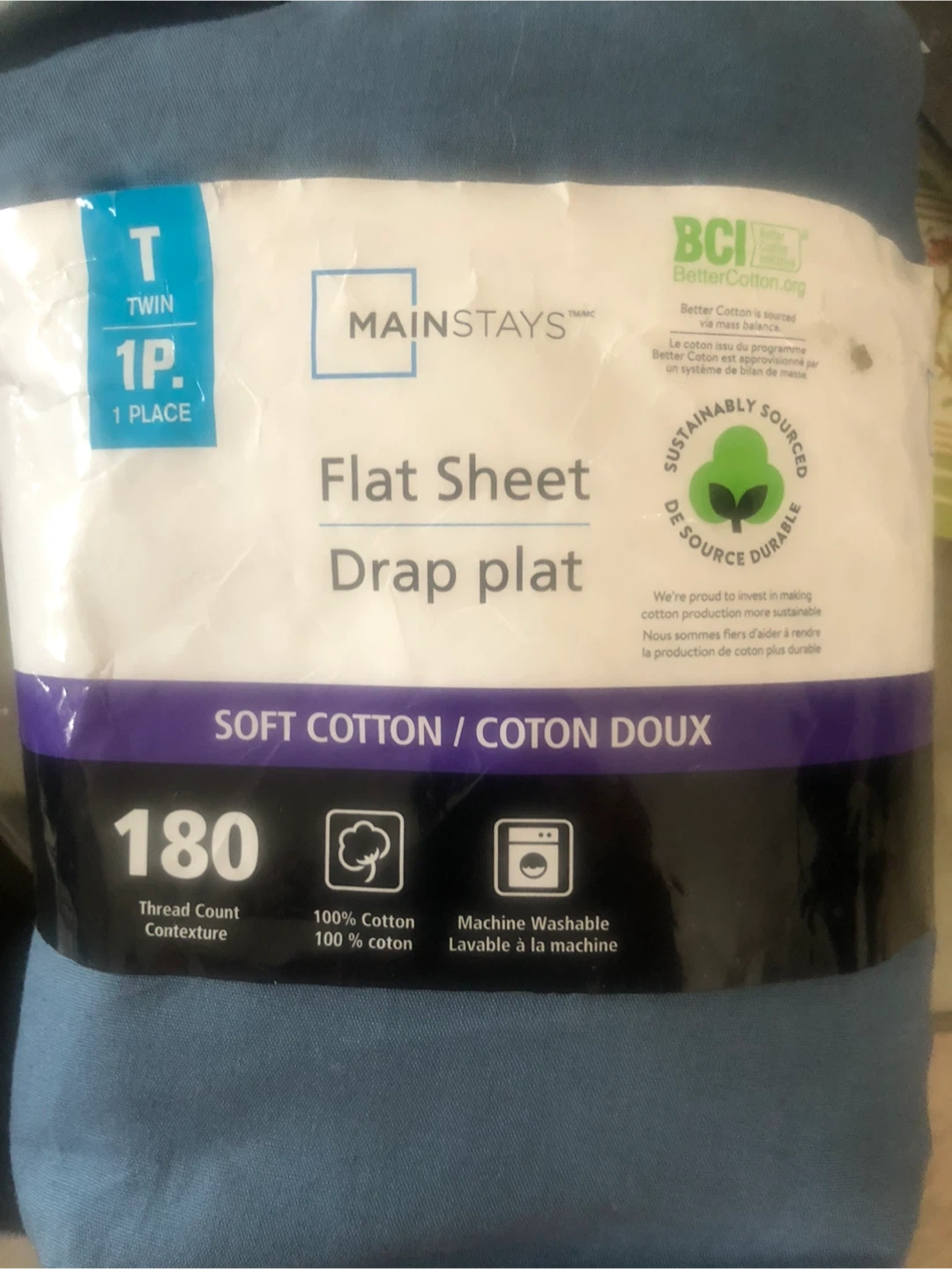 This is a Mainstays twin cotten flat sheet in blue. It's brand new and still sealed in the original packaging.