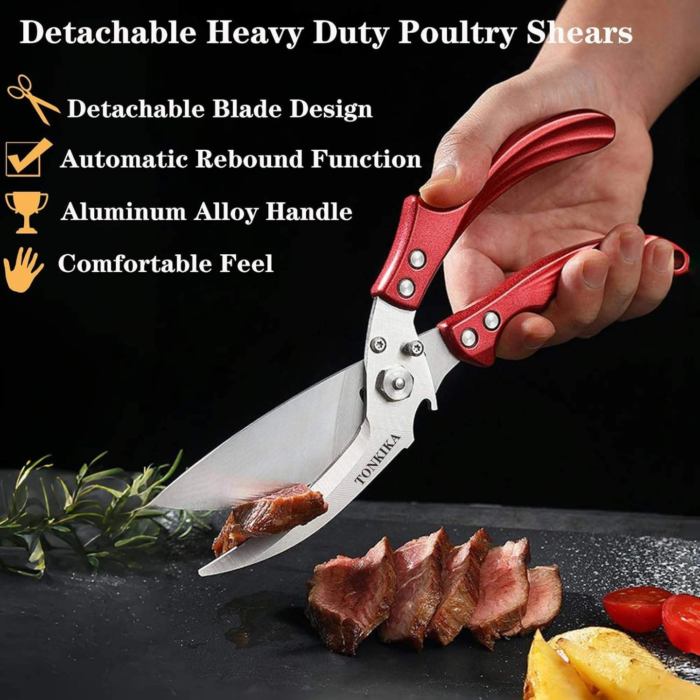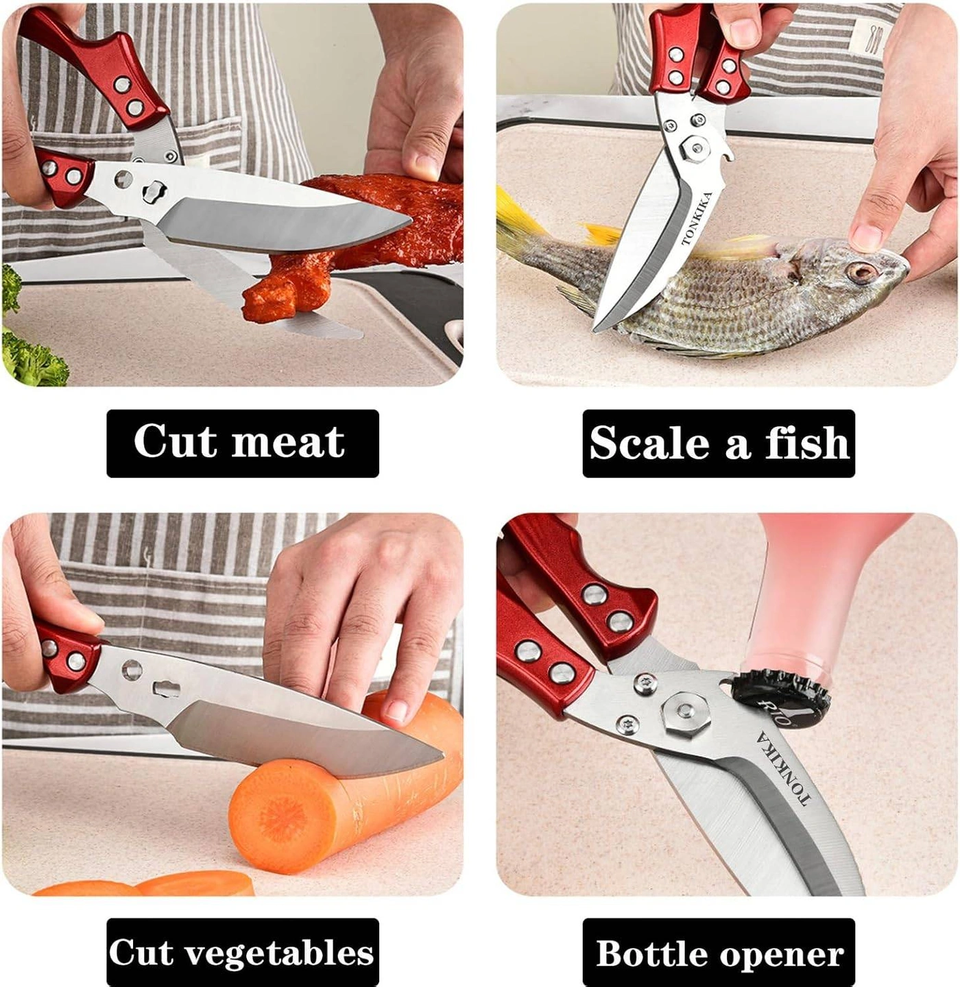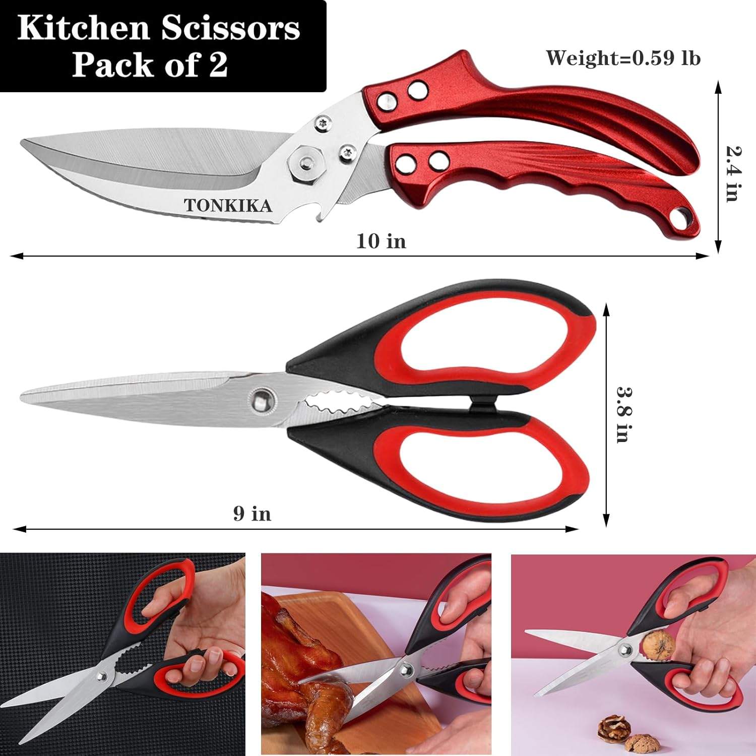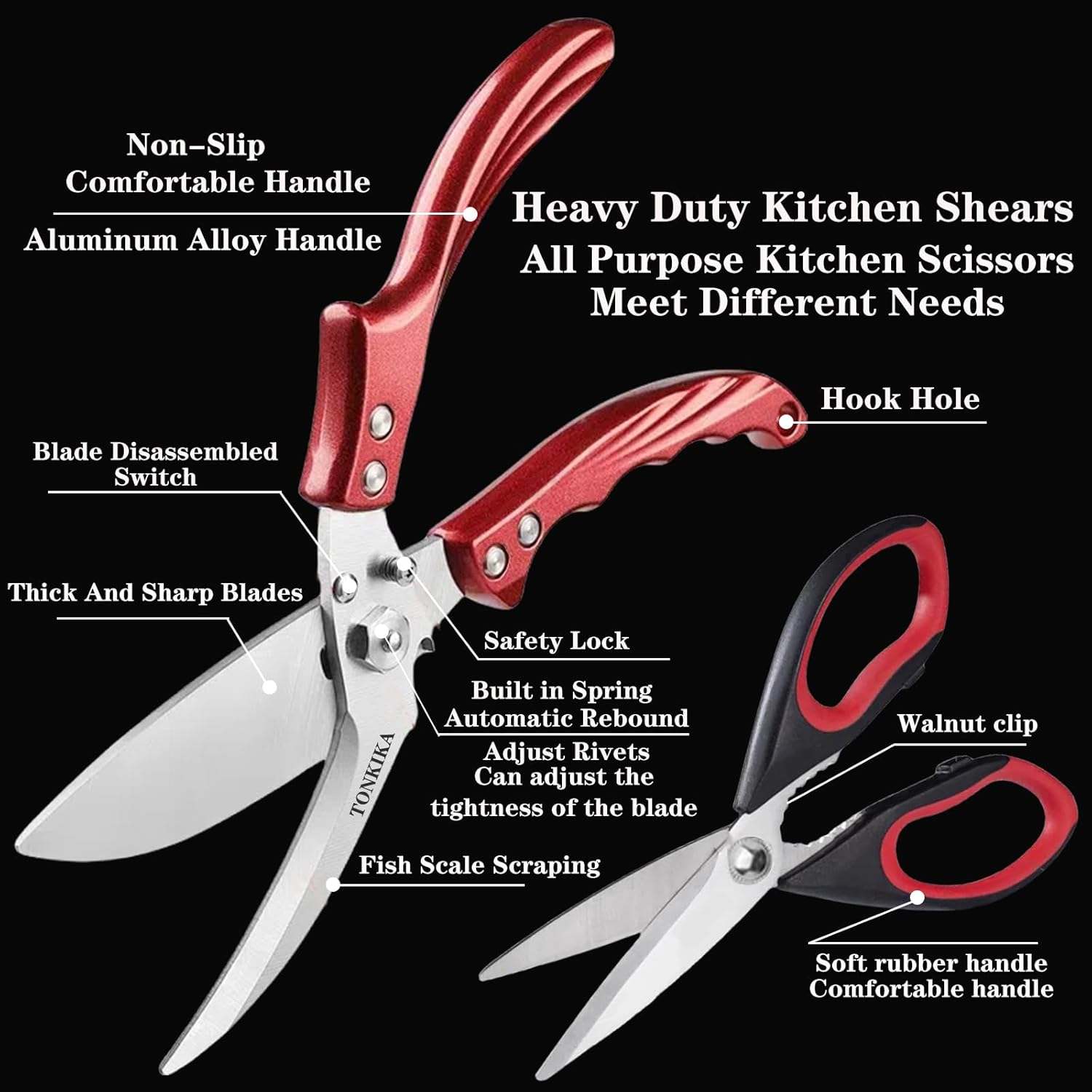 I'm selling a pack of two TONKIKA heavy-duty kitchen scissors! These all-purpose kitchen scissors are designed to meet different needs. They feature: - Non-slip, comfortable handle - Aluminum alloy handle - Detachable blade design - Automatic rebound function - Walnut clip - Bottle opener They're great for cutting meat, scaling fish, cutting vegetables, and more!