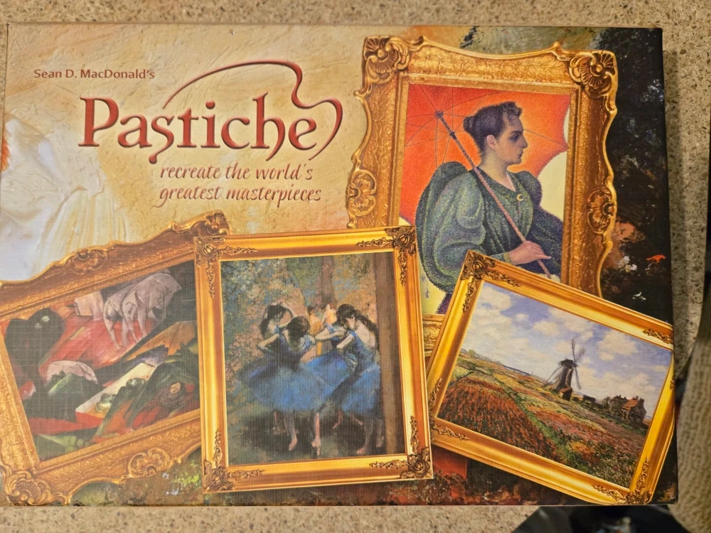 Selling a Pastiche board game by Sean D. MacDonald! It's a fun game where you recreate the world's greatest masterpieces. The box includes all the components: 34 commission cards, 132 palette cards, 34 artist cards, 6 reference cards, 6 player pawns, 36 paint chips, 6 player boards, 1 rule book
