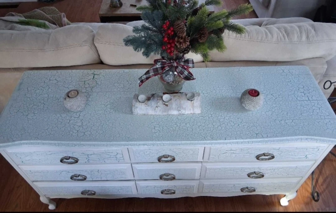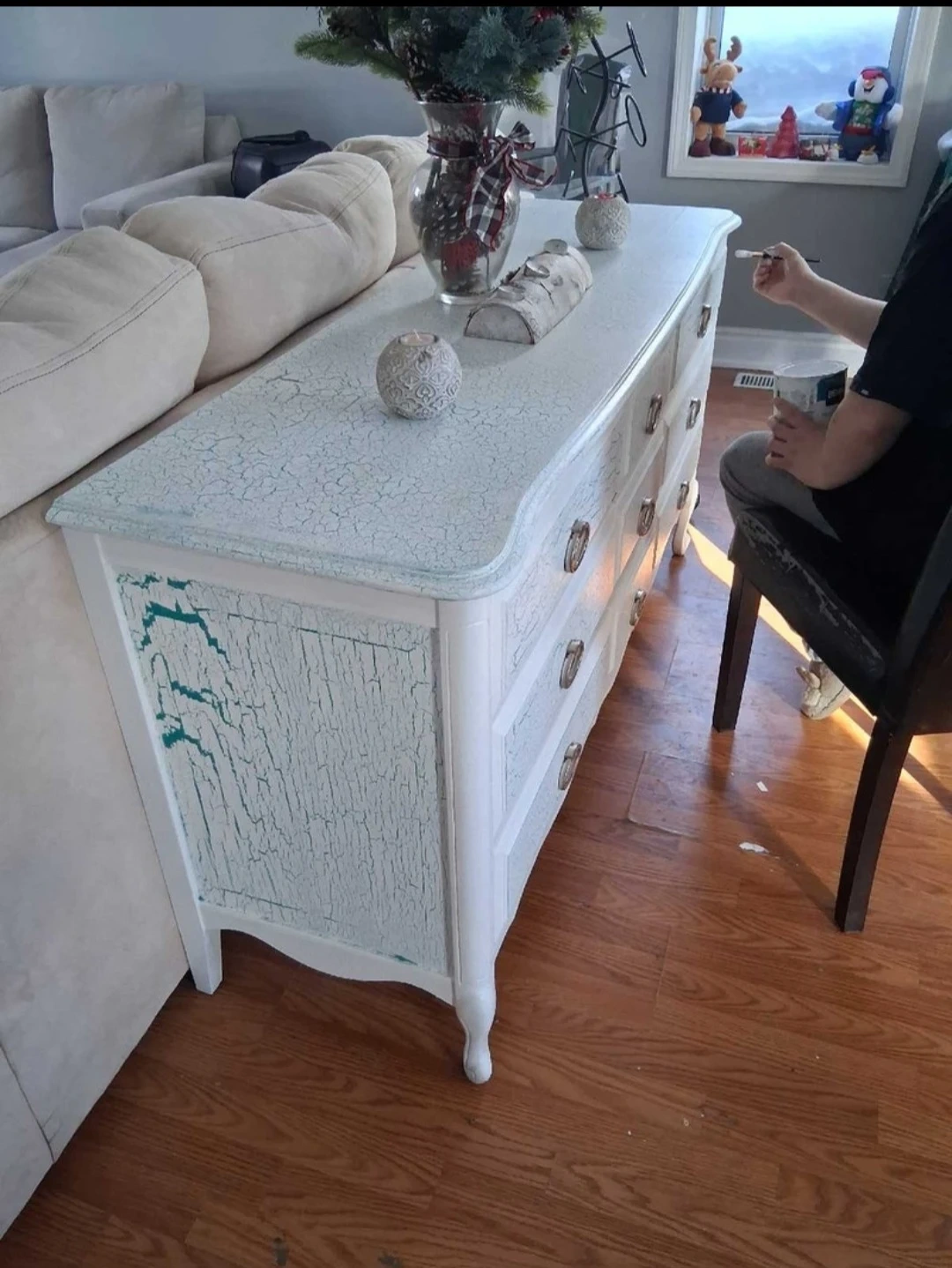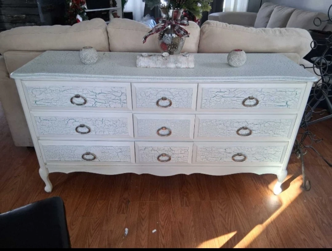 Selling a lovely white dresser with nine drawers. It has a unique crackle finish on top and a classic design that would look great in any bedroom. It's in good condition and ready for a new home!