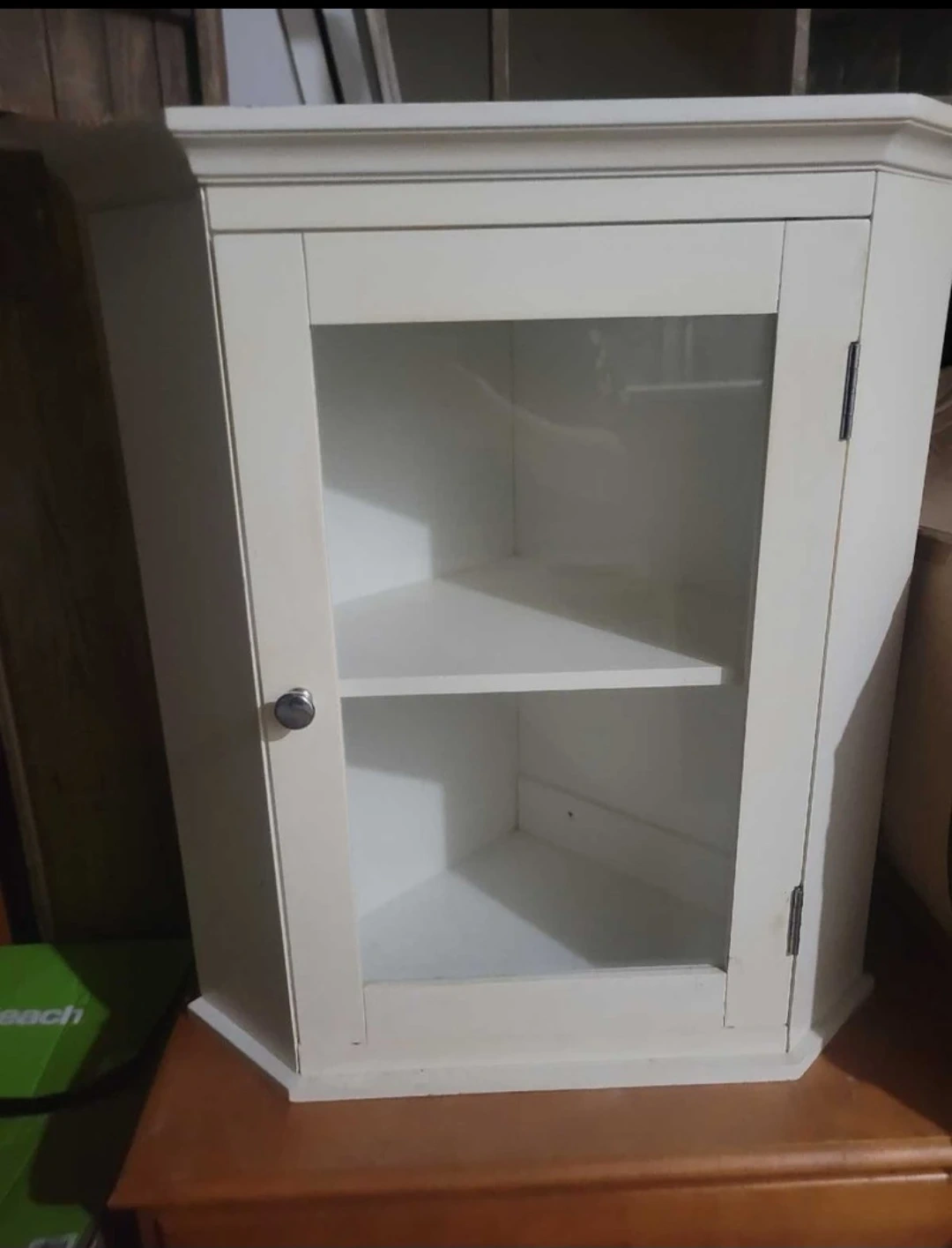 Selling a cute corner cabinet! It's white and has a glass door so you can see what's inside. Great for displaying your favourite items or just adding some extra storage to a small space