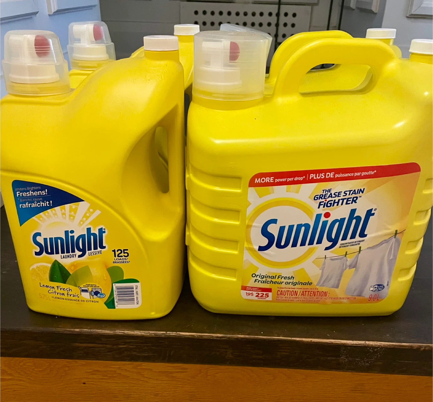 Selling Sunlight laundry detergent! One is Lemon Fresh and the other is Original Fresh. The Lemon Fresh is 5.75L and the Original Fresh is 9.0L. Whitens, brightens, and freshens!