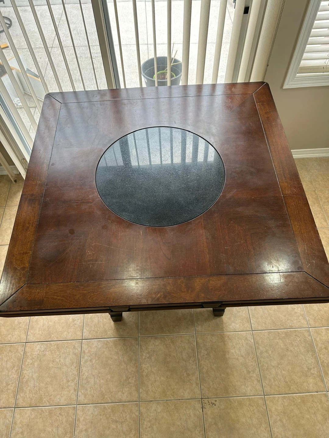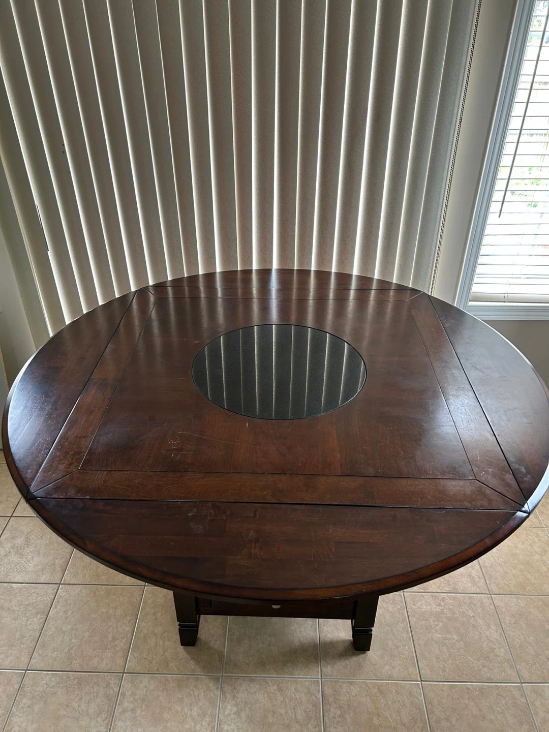 Selling a dark wood dining table that comes with six matching chairs. The table features a unique center design, and the chairs are bar-height, perfect for a kitchen island or a raised dining area. This set would be a great addition to any home!